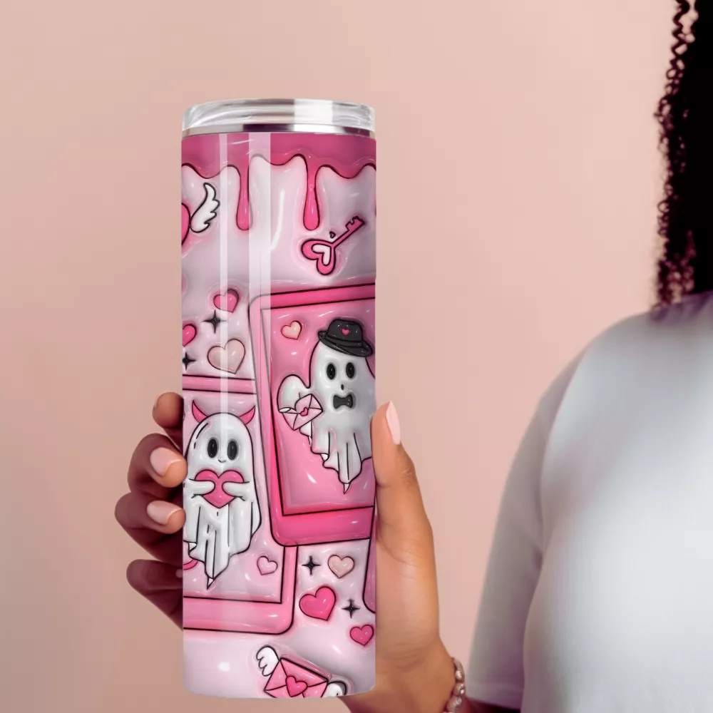A design tele van szívecskékkel, üzenetbuborékokkal, apró ikonokkal és romantikus motívumokkal, amelyek a szeretet és az összetartozás érzését közvetítik. Az egyik szellem „Love You” feliratú táblát tart, míg mások csókkal, virággal vagy kedves gesztusokkal teszik igazán bájossá az összképet. A részletek finoman csillogó hatásúak, így a kulacs igazán különleges, figyelemfelkeltő darab.
