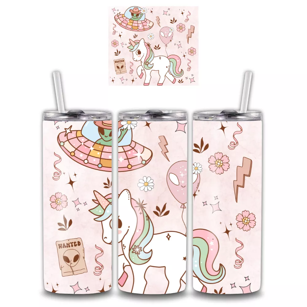 Az Alien Outlaw Alumínium Kulacs a fantázia és a humor tökéletes keveréke. A cowboy kalapos űrlény és az aranyos unikornis vidám, pasztell árnyalatokban kel életre, miközben apró részletek – mint a „Wanted” plakát, űrhajó és csillagok – játékos, mesés hangulatot teremtenek. Ez a kulacs azoknak szól, akik szeretnek kitűnni a tömegből, és egy kis galaktikus varázslatot vinnének a mindennapokba.