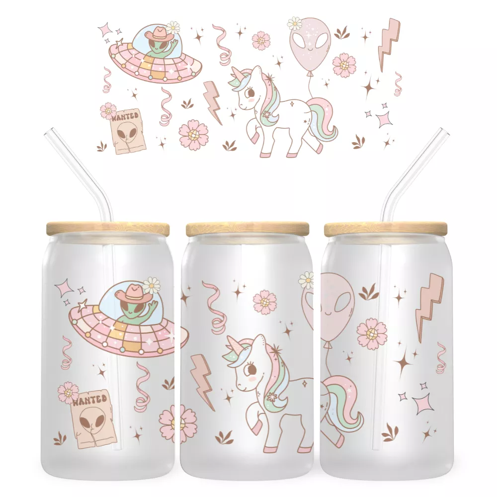 Az Alien Outlaw Bambuszfedeles Pohár a fantázia és a humor tökéletes keveréke. A cowboy kalapos űrlény és az aranyos unikornis vidám, pasztell árnyalatokban kel életre, miközben apró részletek – mint a „Wanted” plakát, űrhajó és csillagok – játékos, mesés hangulatot teremtenek. Ez a pohár azoknak szól, akik szeretnek kitűnni a tömegből, és egy kis galaktikus varázslatot vinnének a mindennapokba.