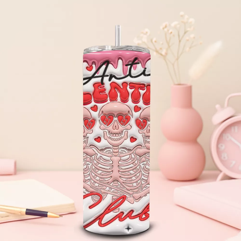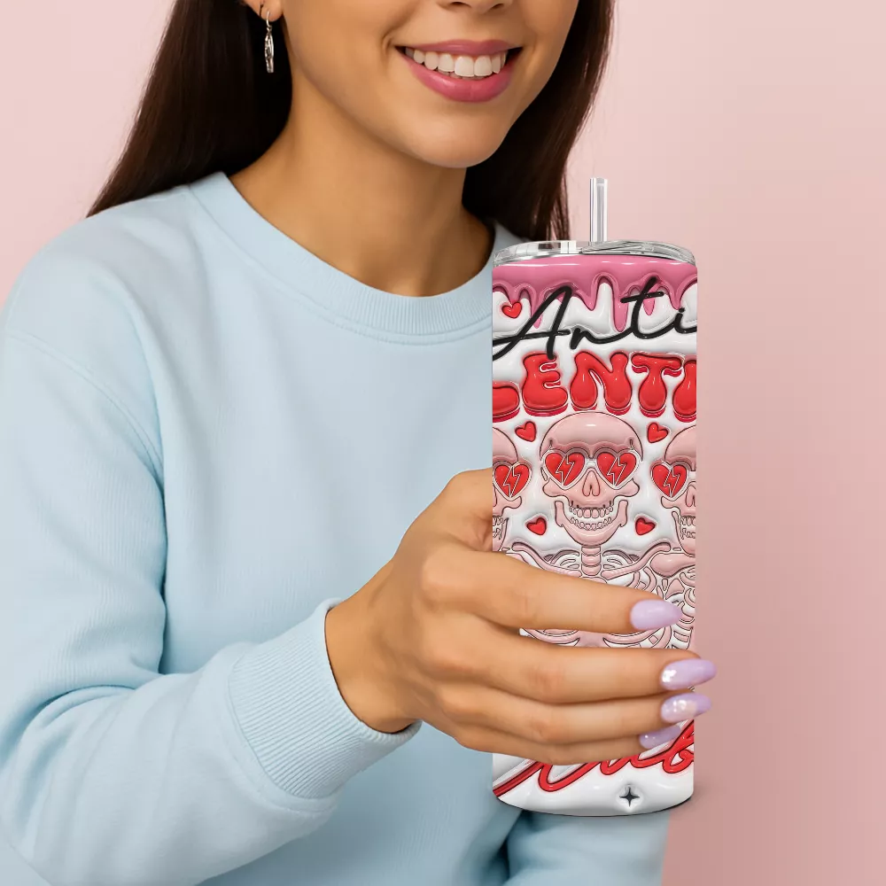 A mintát színes szívek, apró virágok és csillogó részletek egészítik ki, amelyek kontrasztot alkotnak az „Anti Valentine Club” felirattal. A felső részen megjelenő csorgó hatás és a piros-rózsaszín árnyalatok erős, karakteres összképet adnak a kulacsnak. Ez a dizájn ideális választás azok számára, akik nem az érzelgős Valentin-napi üzeneteket keresik, hanem inkább egy humoros, határozott állásfoglalást.