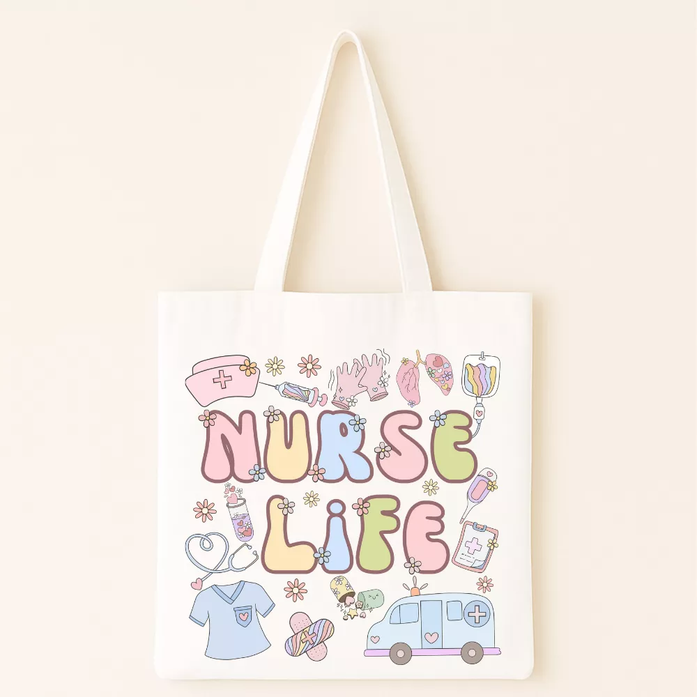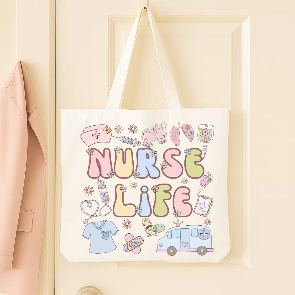 Ez a vászontáska nem csupán egy praktikus kiegészítő, hanem egy vizuális üzenet is: a „Nurse Life” nem csak munka, hanem hivatás és életérzés. A lágy pasztell színek és a kedves ikonok barátságos, pozitív hangulatot sugároznak, miközben büszkén képviselik az ápolói közösséget.