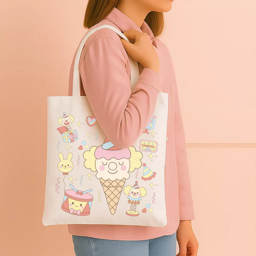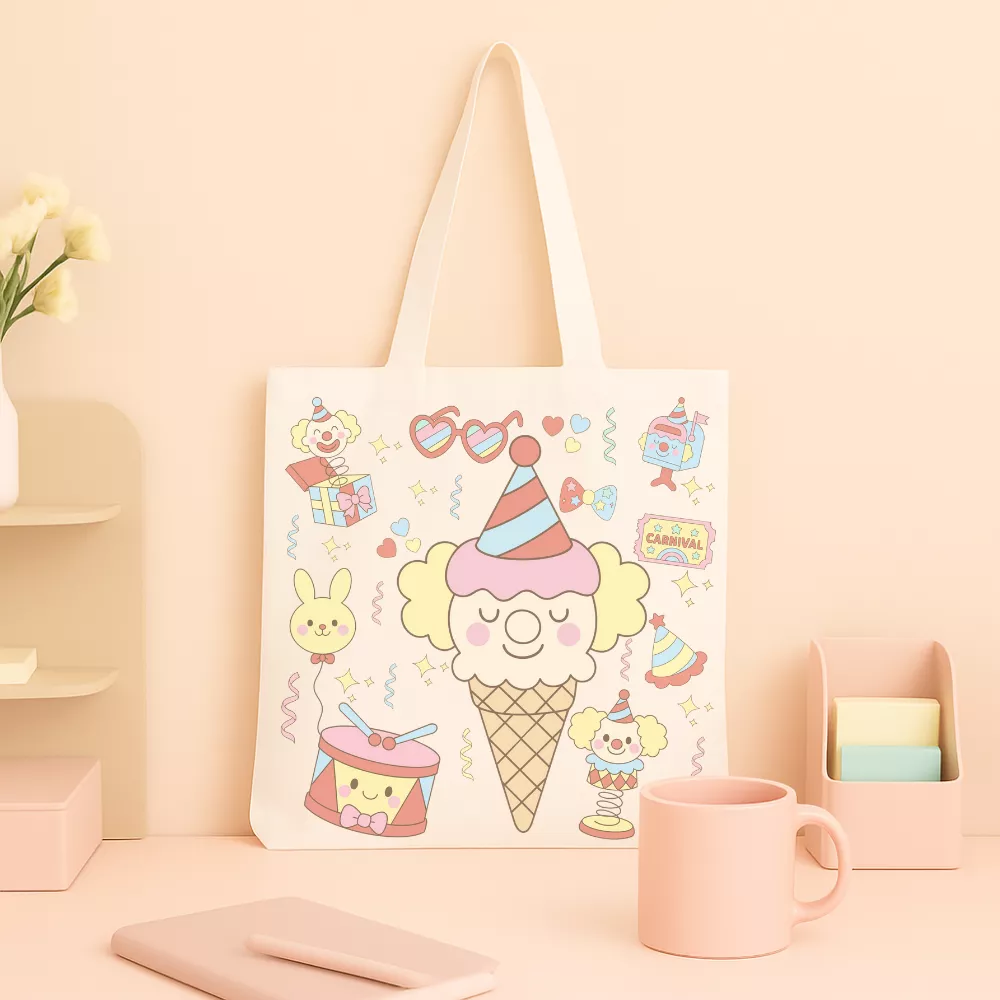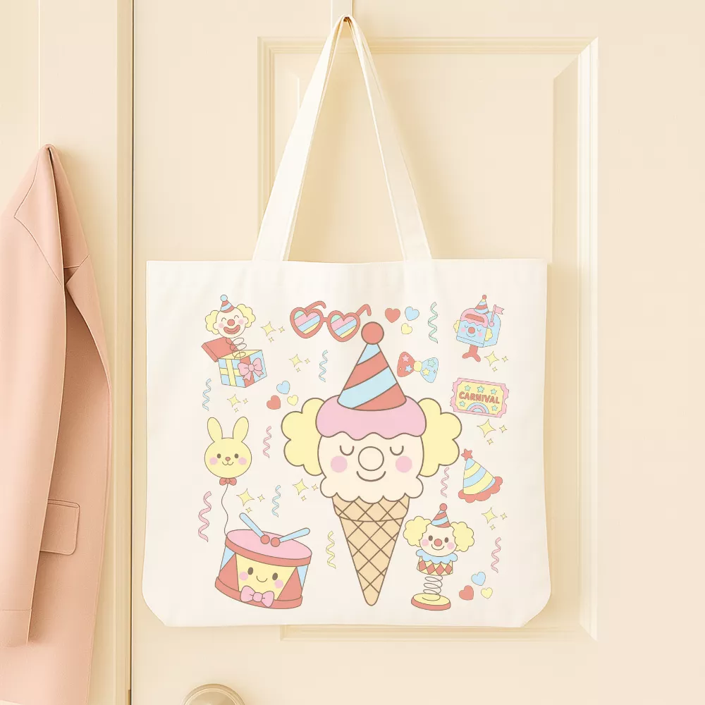 A Carnival Laughs Vászontáska egy igazi vidám kavalkád, amely a cirkusz felszabadult, játékos hangulatát hozza el minden pillanatba. A központi grafika egy aranyos, pasztellszínekben pompázó fagylaltbohócot ábrázol, körülötte lufifigurákkal, masnikkal, konfettikkel, parókás mini bohócokkal és cukorkaszínű kiegészítőkkel. A dizájn tiszta gyermeki örömöt sugároz: mintha egy színes cirkuszi menet elevenedne meg a táska teljes felületén.