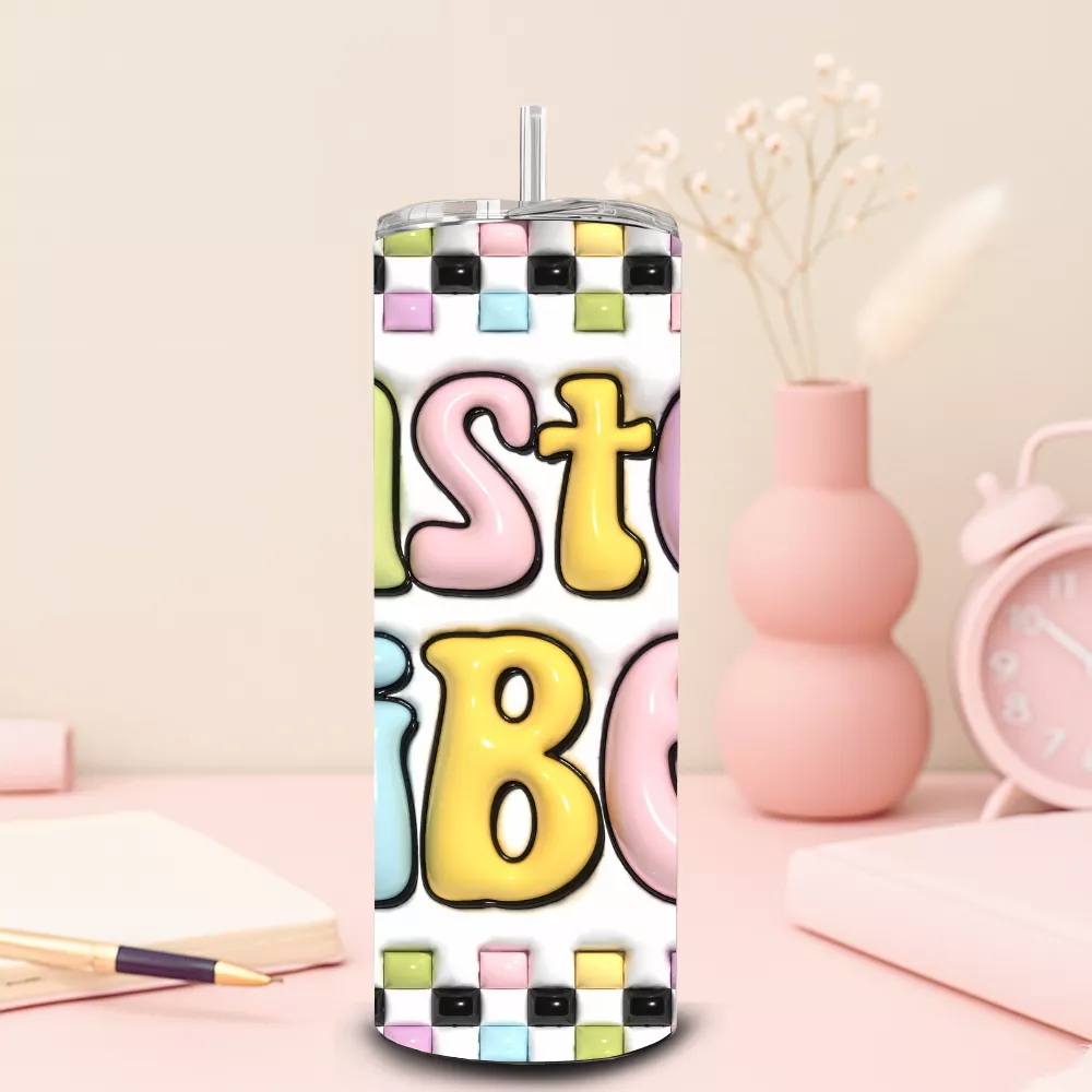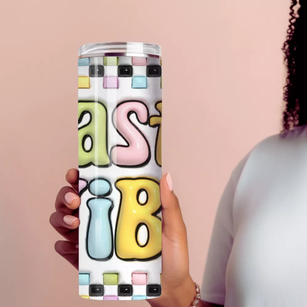 Az Easter Glow Alumínium Kulacs igazi tavaszi energiát sugároz. A „Easter Vibes” felirat pasztell színekben, játékos betűtípussal jelenik meg, amely azonnal jókedvre hangol. A színes keret és a letisztult fehér alap modern, mégis vidám megjelenést ad a kulacsnak.