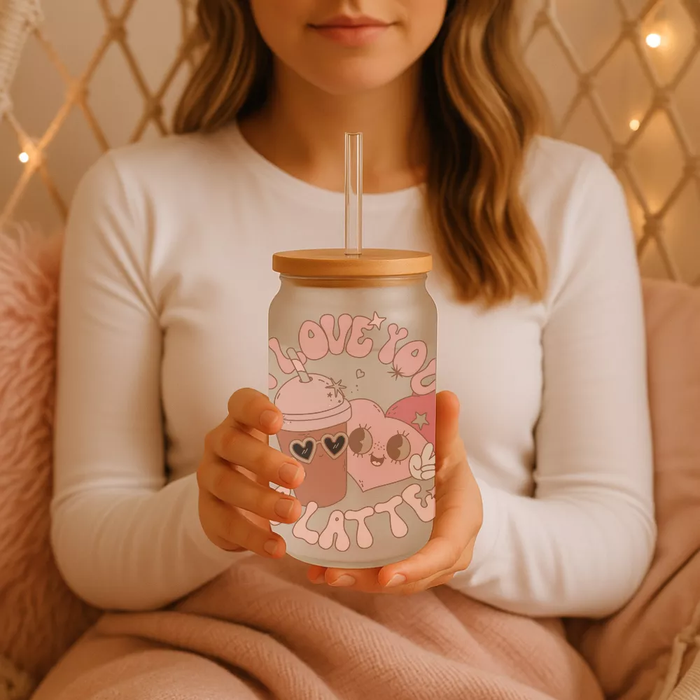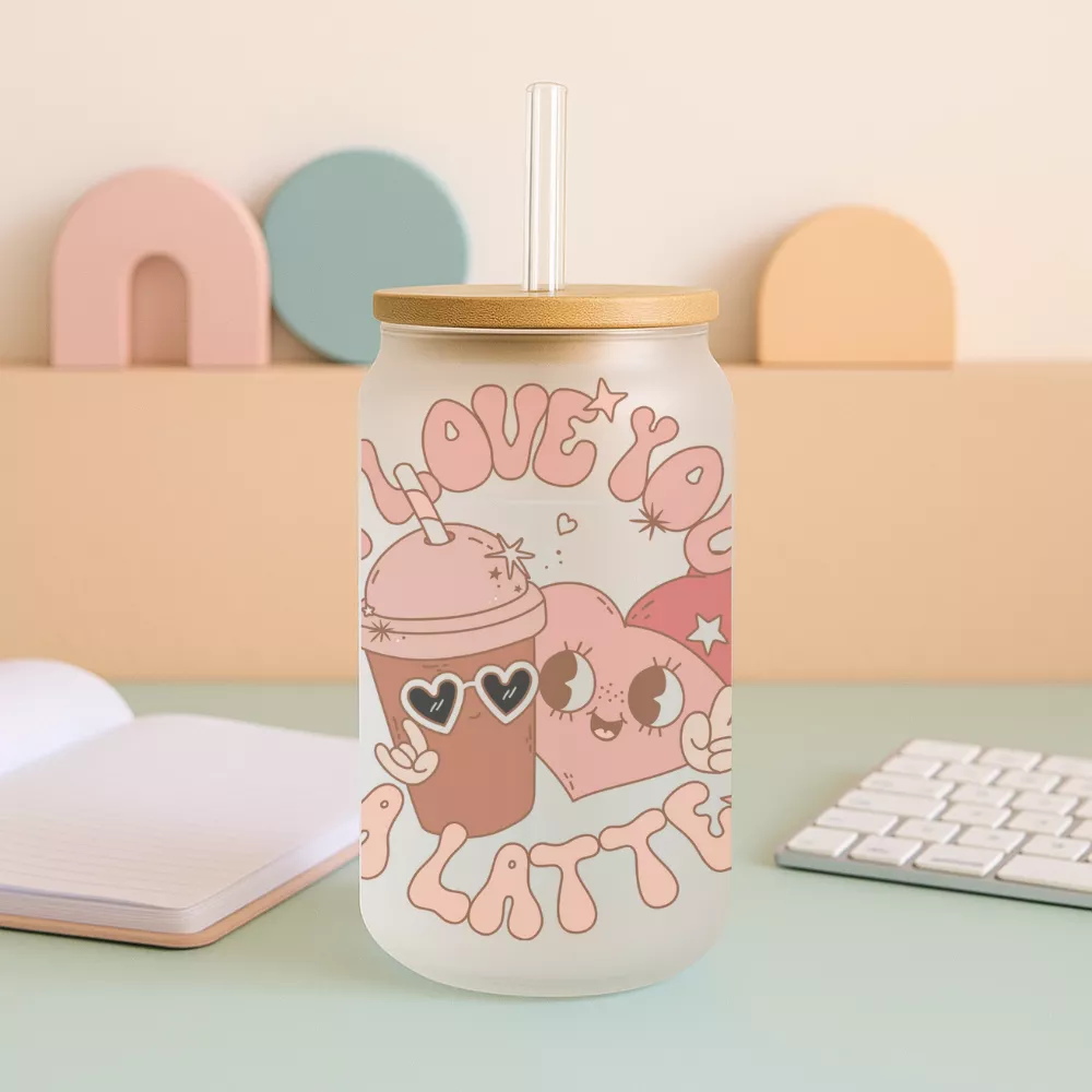 Az Enchanted Touch Bambuszfedeles Pohár a romantika, a játékosság és a mindennapi örömök tökéletes találkozása. A központi motívum egy szív alakú páros és egy mosolygó, jegeskávét idéző ital, amelyek együtt a szeretet és a közös pillanatok üzenetét közvetítik. A vidám felirat — I Love You Latte — egyszerre kedves, humoros és meghitt, így tökéletesen illik egy pasztell hangulatú, szeretettel teli designhoz. Az apró szívek, autók, csillagok és zenei motívumok finoman egészítik ki az illusztrációt, meleg és barátságos összhatást teremtve.