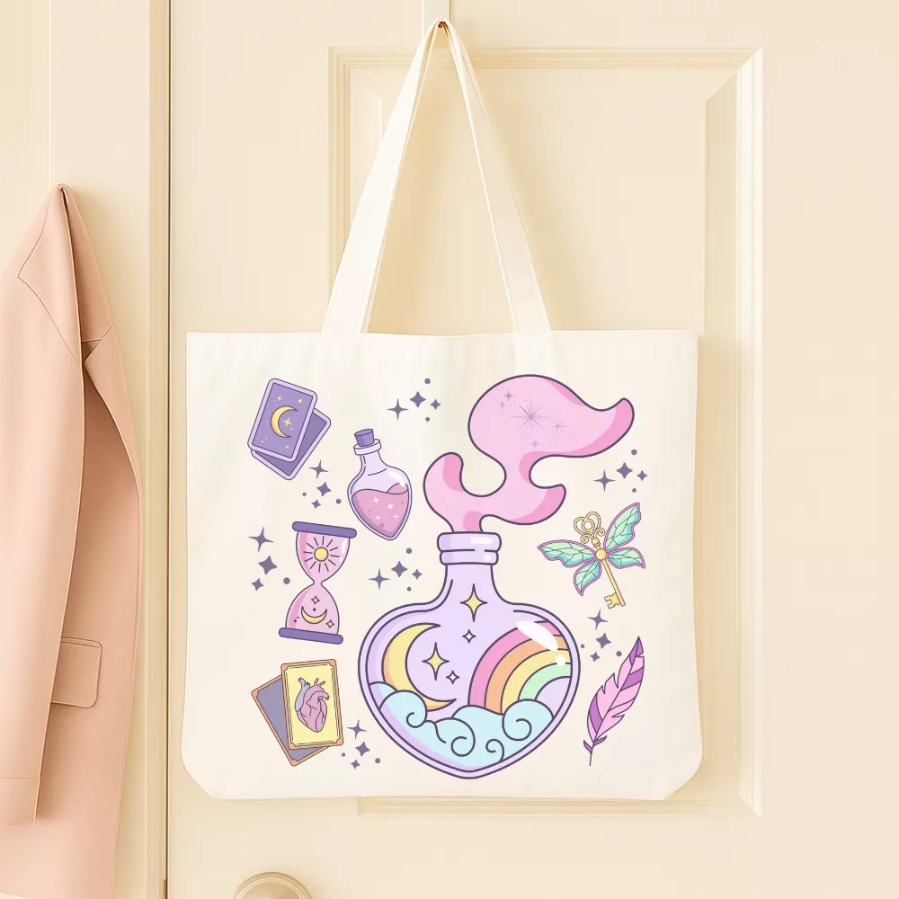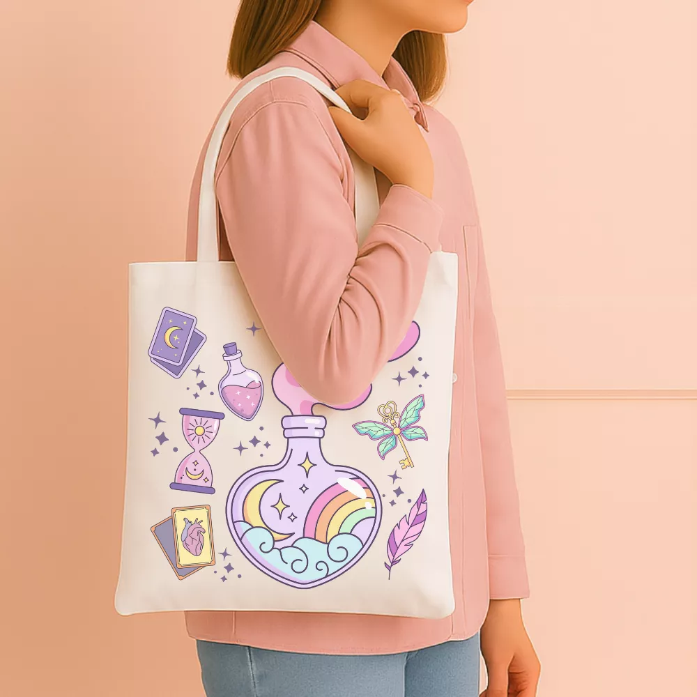 A Fairy Spell Vászontáska azoknak készült, akik hisznek benne, hogy a világ tele van apró csodákkal — csak meg kell találni a megfelelő varázsitalt hozzá. A központi grafika egy szív alakú üvegcsét ábrázol, amelyből pasztellrózsaszín füst száll fel, miközben a palack belsejében szivárvány, hullámok és apró csillagok kavargó elegye teremti meg a tündérmese-hangulatot. A táskát körülölelő tarot lapok, varázsfiolák, gombák, kulcsok és tollak egy misztikus, álomszerű világot idéznek meg, mintha egy mesés történet lapjai között sétálnál.