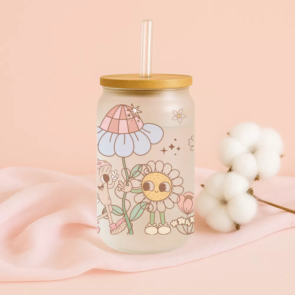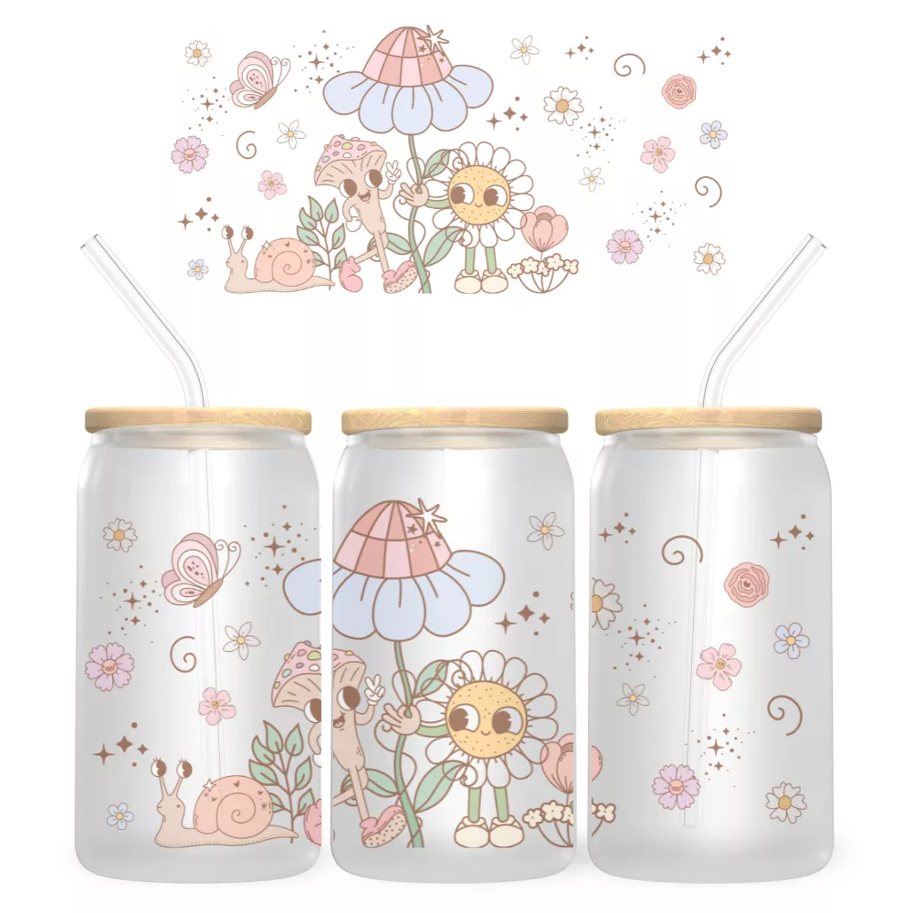 A Floral Fantasy Bambuszfedeles Pohár egy mesés, természetközeli világot hoz el a mindennapokba. A bájos margarétafigurák, a kalapos gombamanó, a kíváncsi csiga és a könnyedén repkedő pillangók együtt egy varázslatos jelenetet alkotnak, amely egyszerre játékos és megnyugtató. A pasztell színek és a finom részletek harmonikusan simulnak össze, így a dizájn tökéletes választás azoknak, akik szeretik a kedves, természet ihlette grafikákat.