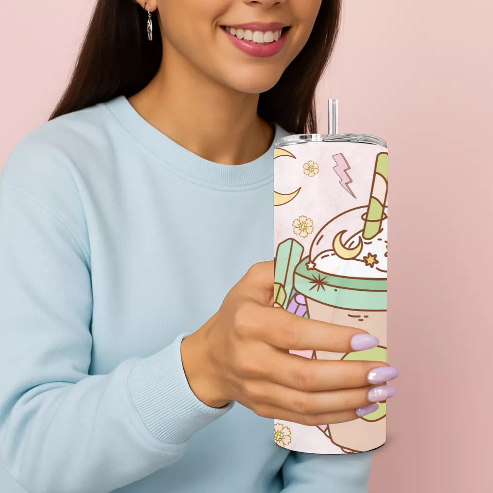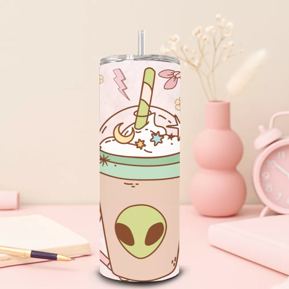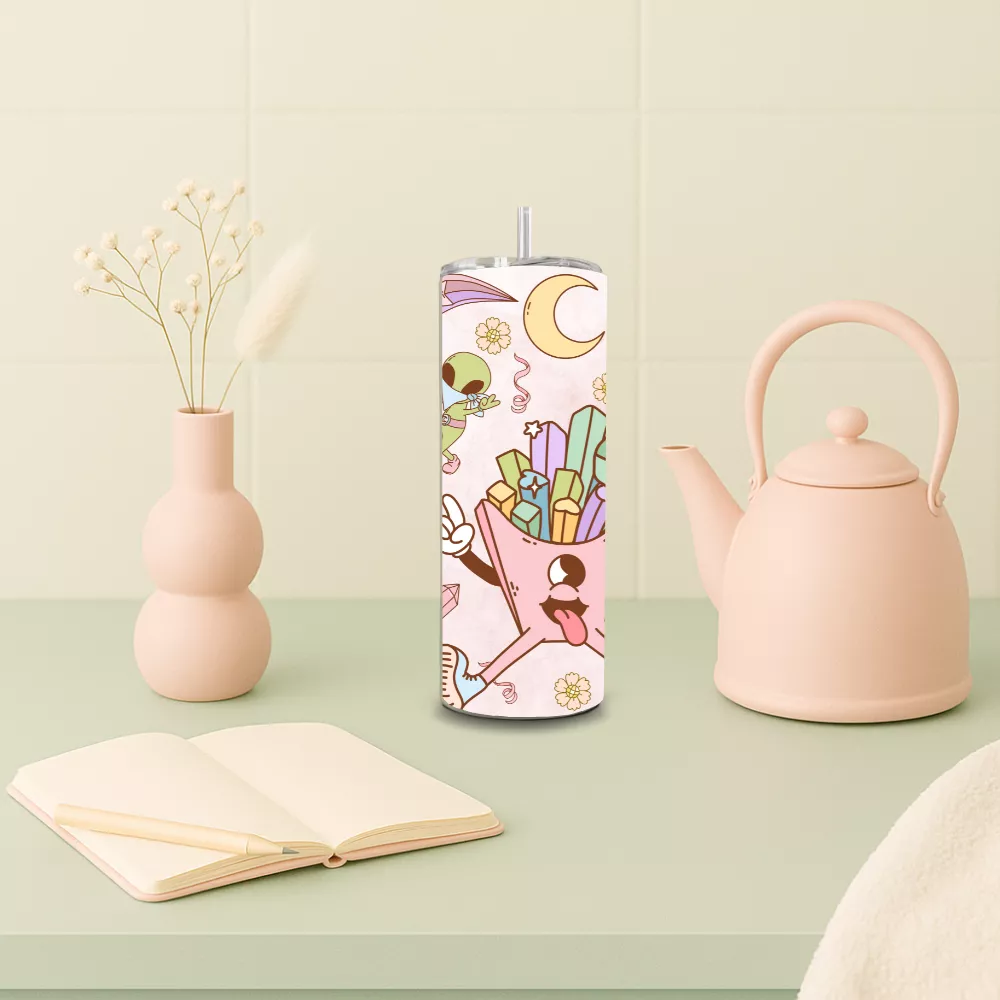 A Flowerfield Bandit Alumínium Kulacs azoknak készült, akik szeretnek kitűnni a tömegből. A bohém, pasztellszínű dizájnban egy mókás űrlény és egy tejszínhabos ital találkozik – körülöttük csillagok, virágok, villámok és bandana motívumok repkednek, igazi űrwestern hangulatot teremtve. Ez a kulacs a jókedv, a lazaság és a kreativitás tökéletes megtestesítője.