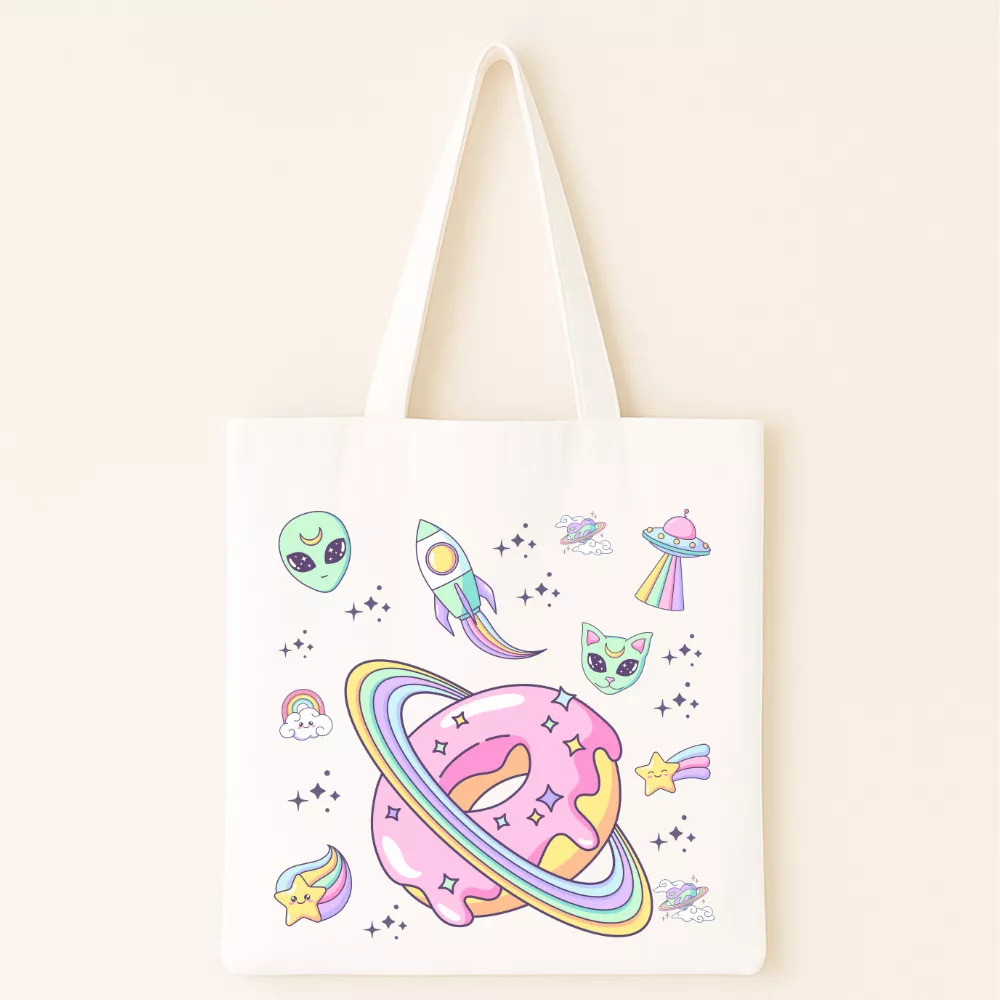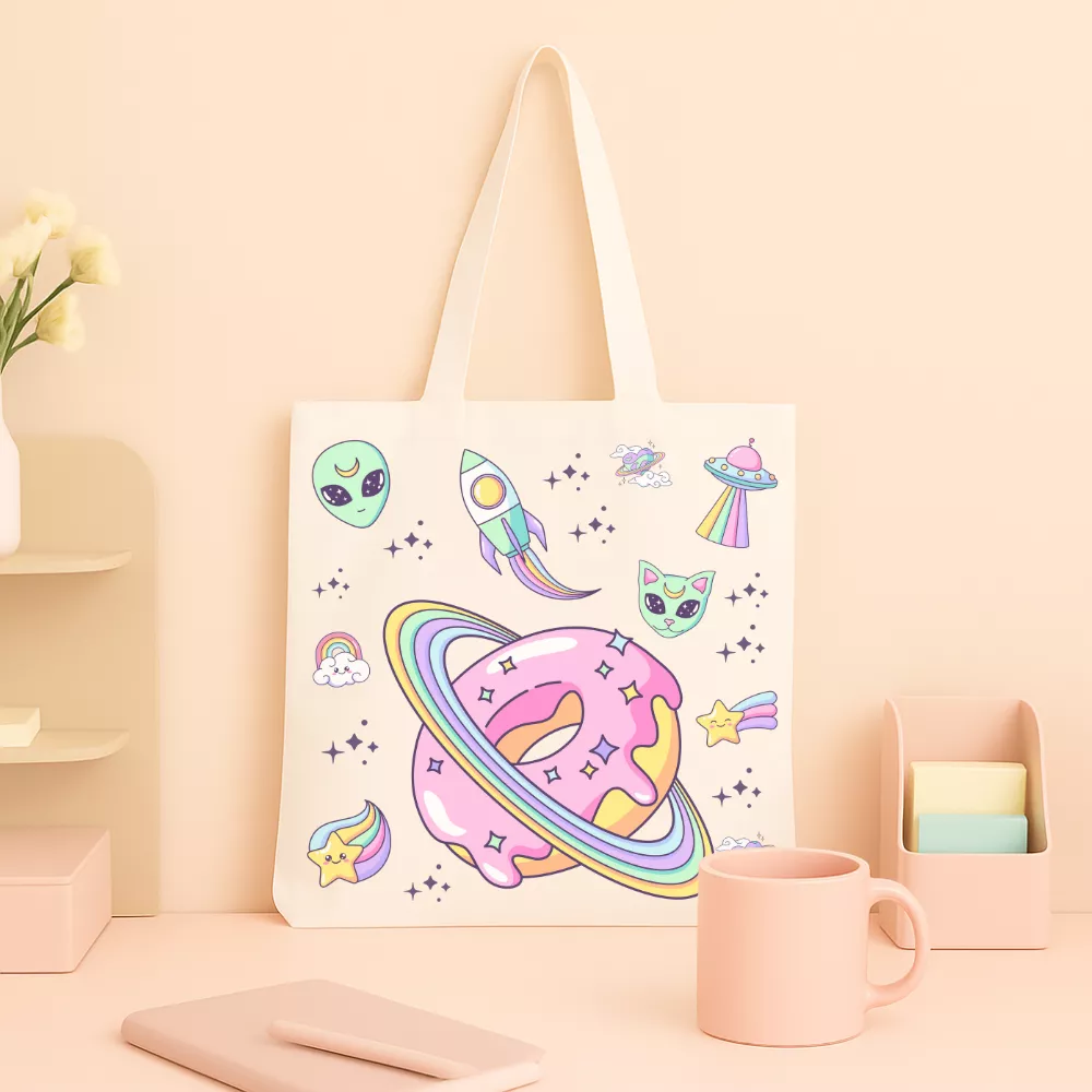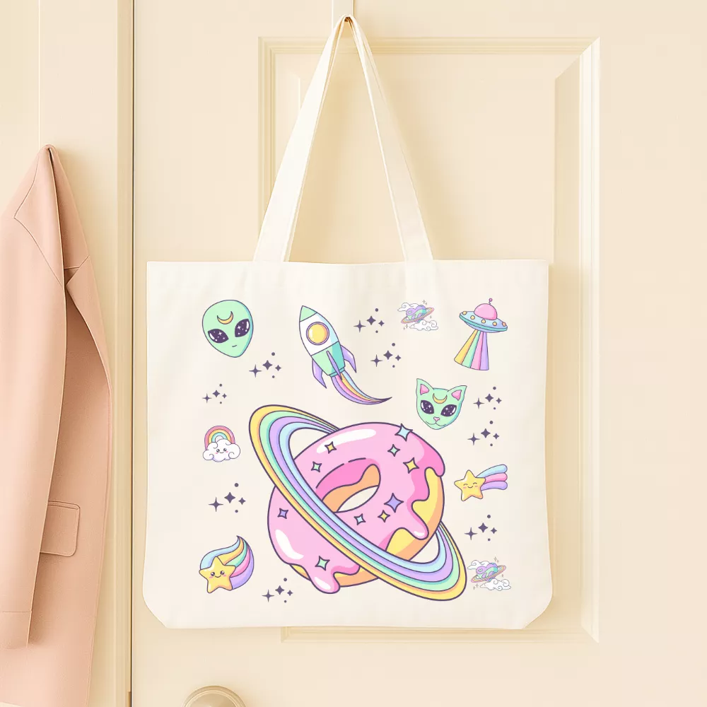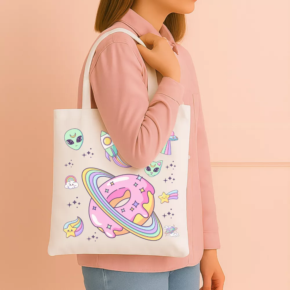 A Galaxy Donut Vászontáska egy édes és kozmikus kaland hangulatát hozza a mindennapjaidba. A középen ragyogó, szivárványgyűrűs rózsaszín fánk bolygó körül vidám űrlények, repülő rakéták, mosolygó csillagok és pasztell UFO-k úsznak – az egész dizájn játékos, könnyed és szerethető. Ez a táska azok számára készült, akik szeretik a különleges, kedves és fantáziadús mintákat.