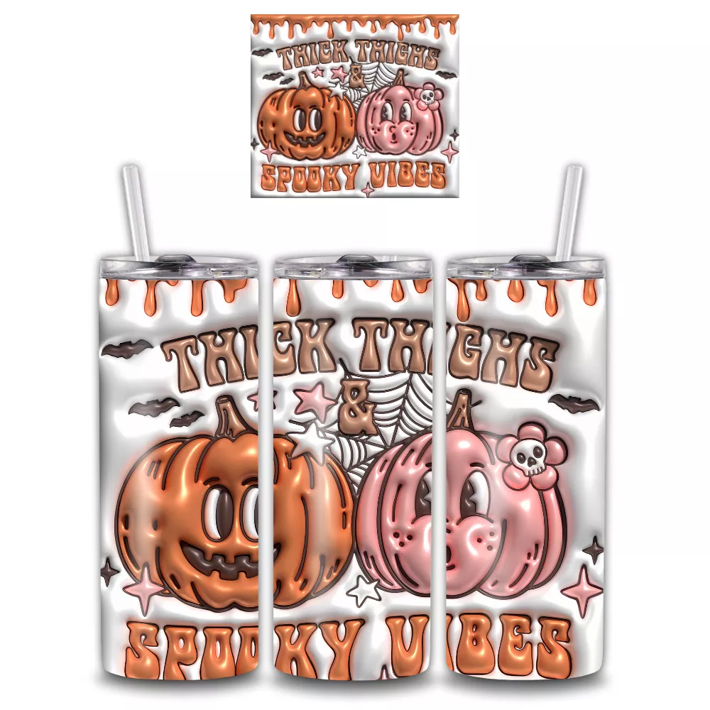 A Ghost Essence Alumínium Kulacs játékos és vagány Halloween-hangulatot hoz a mindennapokba. A dizájn középpontjában két kedves, karakteres tökfigura áll – egy klasszikus narancssárga és egy bájos rózsaszín –, körülöttük 3D hatású csillagok, pókhálók és apró, cuki részletek, amelyek életre keltik a „thick thighs & spooky vibes” üzenetet. A meleg narancs és a lágy pasztellrózsaszín különleges, modern halloweenes összhatást teremt.