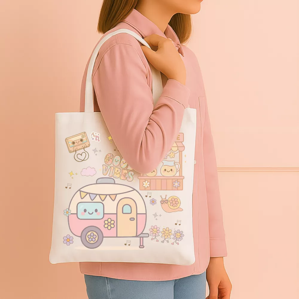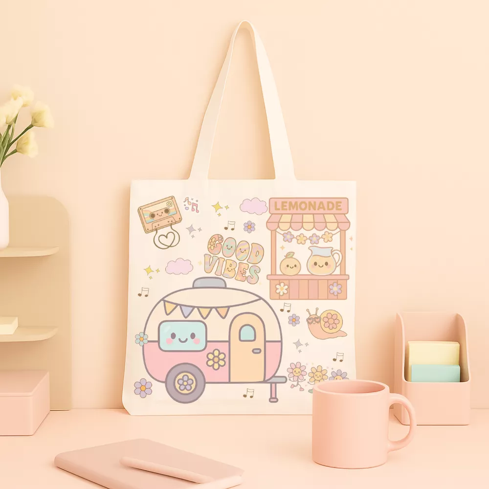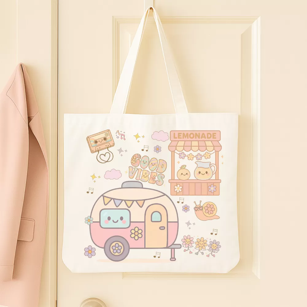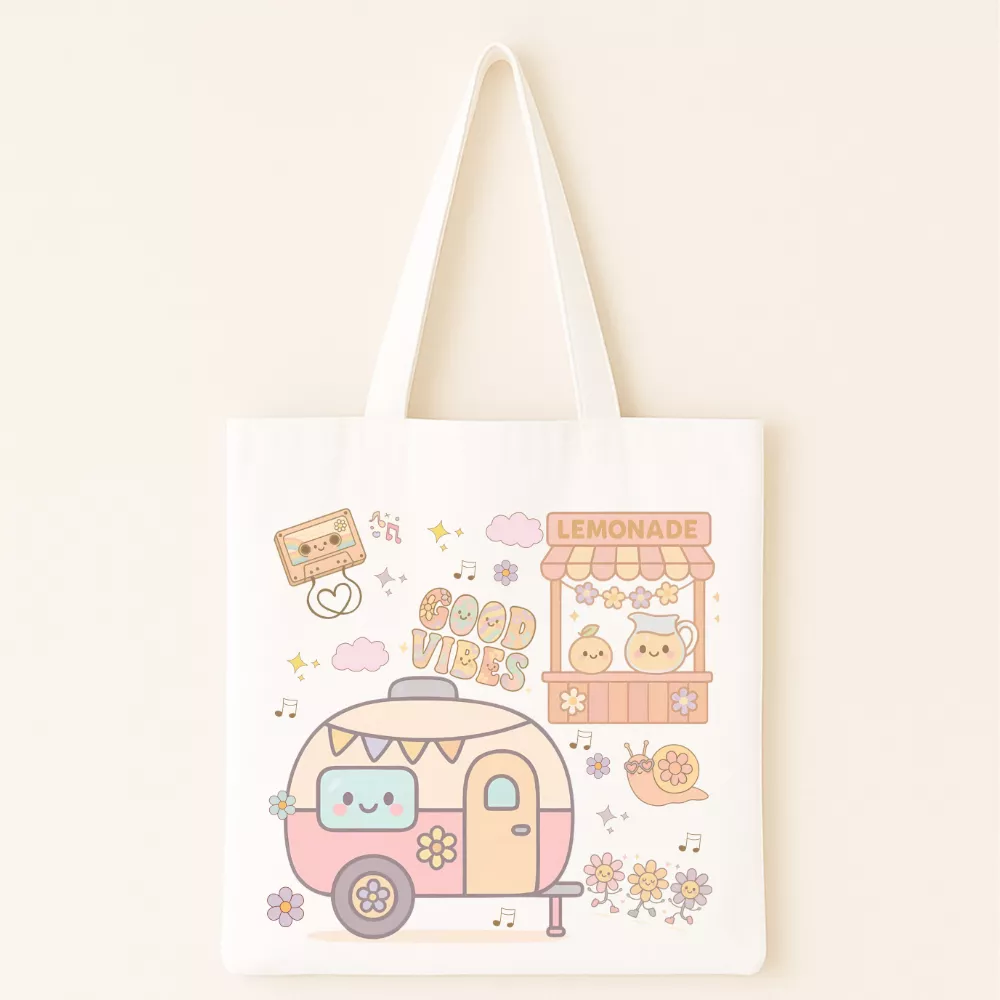 A Groovy Days Vászontáska a nyári napok vidám, gondtalan hangulatát idézi meg. Pasztell színeivel és aranyos mintáival – limonádéstand, virágos lakókocsi, mosolygós csiga és „Good Vibes” felirat – ez a táska a napsütéses délutánok örömét és a nyári szabadság életérzését hozza el. A dizájn bájosan retro, mégis modern, így tökéletes kiegészítője a mindennapi jókedvnek és laza pillanatoknak.