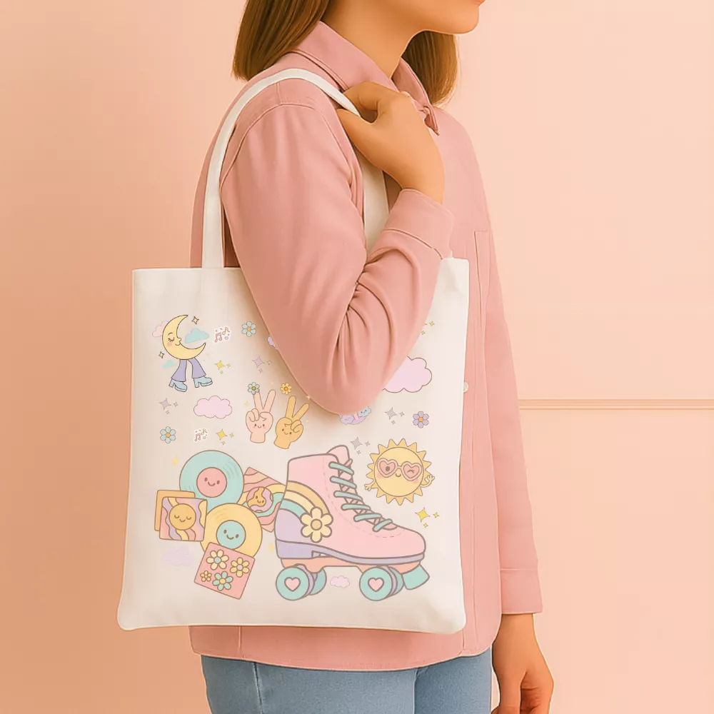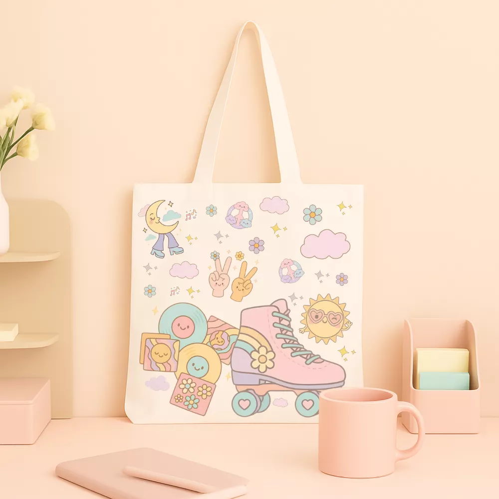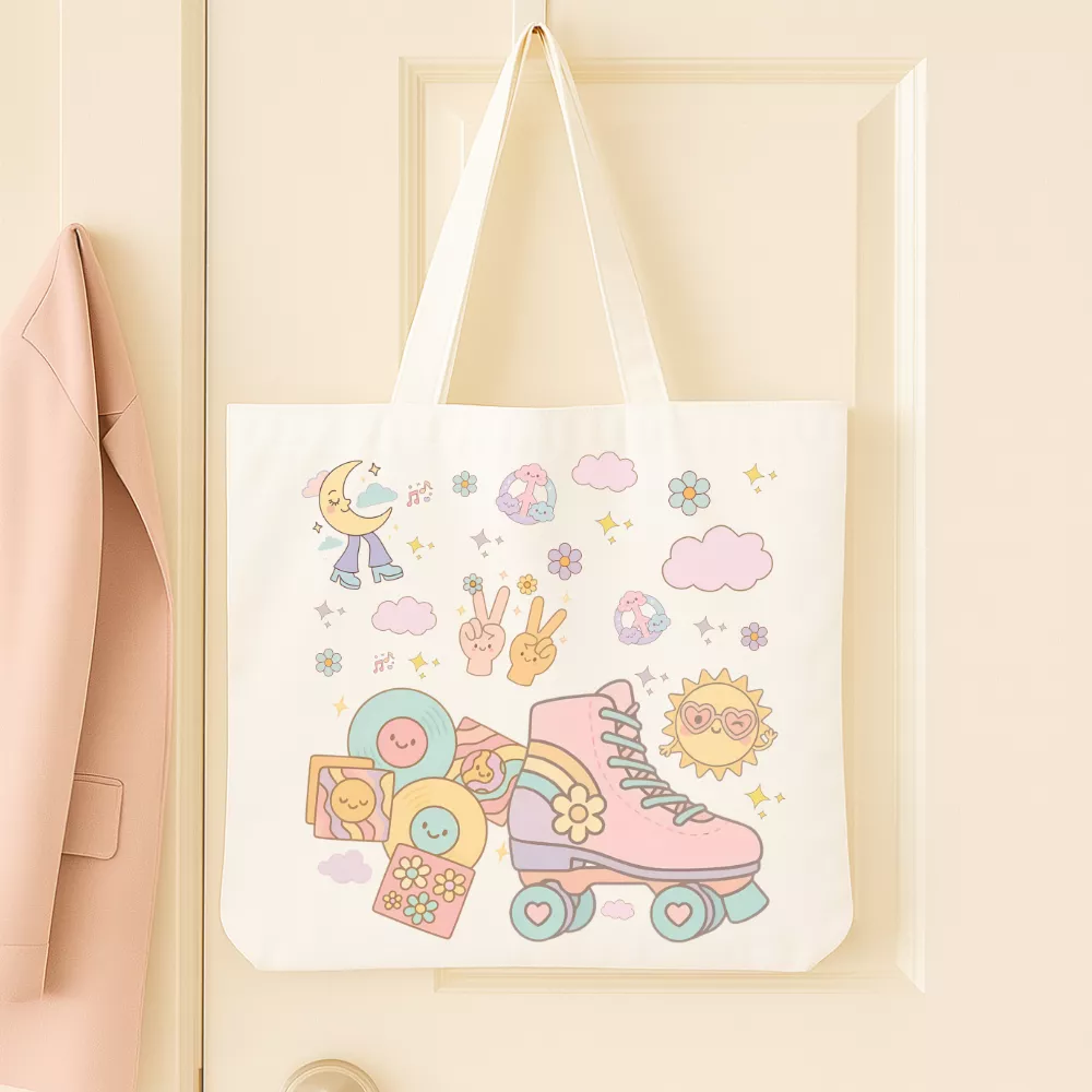 A Groovy Disco Vászontáska a ’70-es évek hangulatát hozza el pasztell színekben és vidám részletekben. A táskát díszítő retro motívumok – görkorcsolya, mosolygós nap, táncoló hold és peace-jelek – igazi életörömöt sugároznak. A dizájn a gondtalan táncos esték, a diszkófények és a szabadság hangulatát idézi meg, miközben minden napodba egy kis vidámságot csempész.