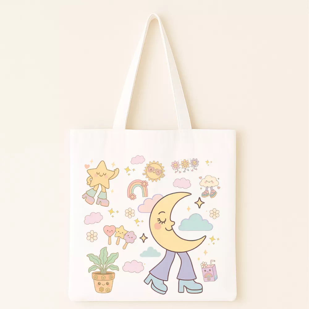 A Groovy Moon Vászontáska a retro hangulat és a derűs éjszakai égbolt tökéletes harmóniáját hozza el. A pasztell árnyalatokban táncoló motívumok – mosolygó hold, csillag, nap, szivárvány és virágok – egy varázslatos, álomszerű világot idéznek, ahol minden pillanatban ott rejtőzik a nyugalom és a jókedv. A dizájn játékos, mégis elegáns, így ez a táska stílusos kiegészítője lehet mindennapjaidnak.