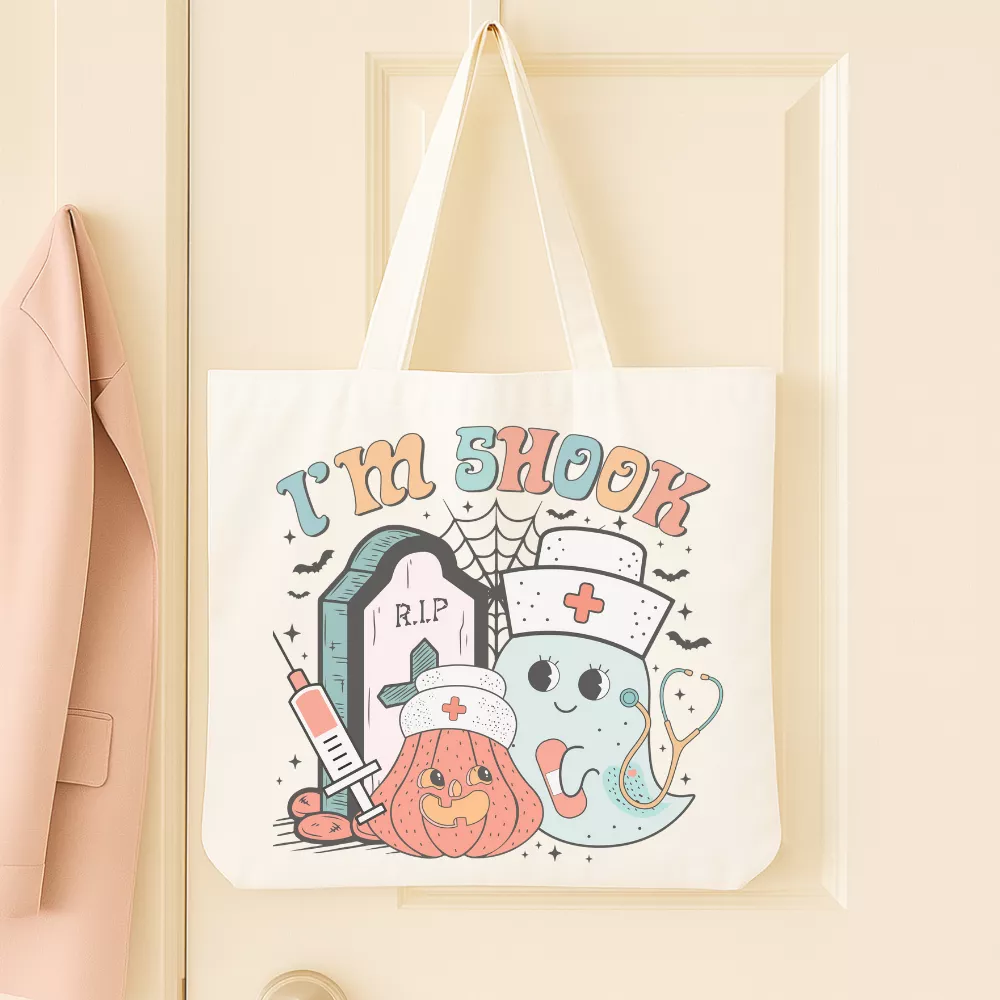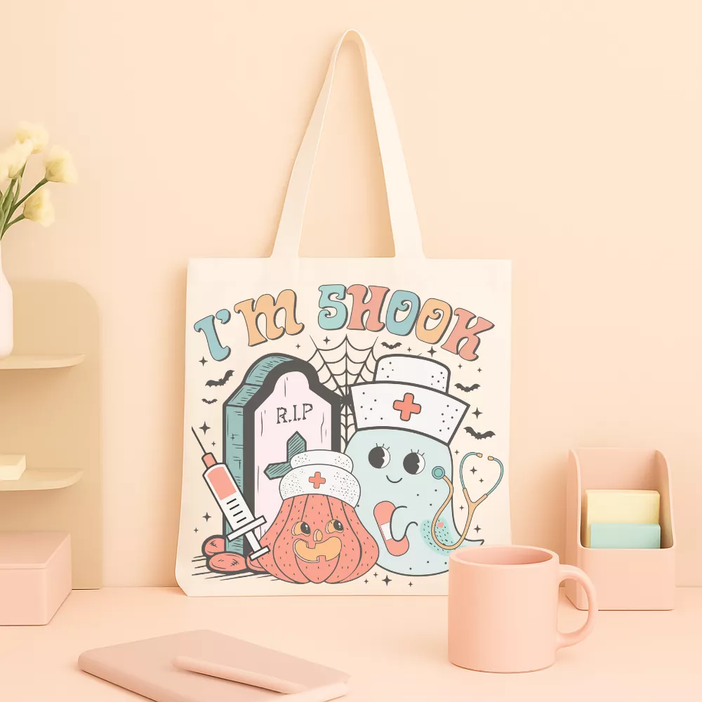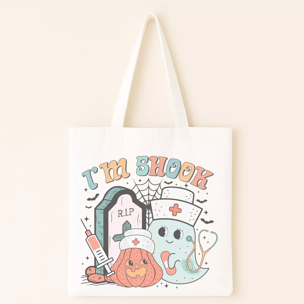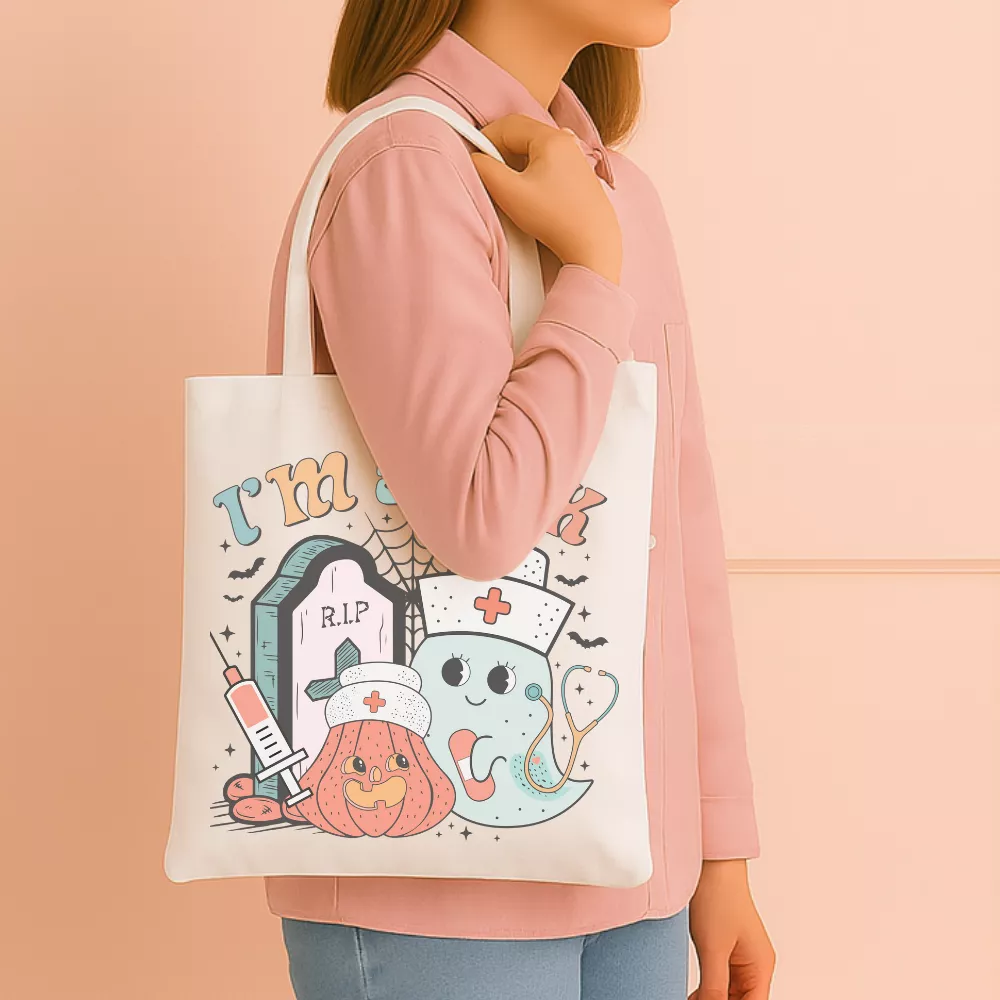 A Haunted Nurse Vászontáska egy igazán mókás és karakteres darab, amely a Halloween hangulatot és a nurse life világát ötvözi játékos, szerethető grafikával. A táska központi mintáján az „I’m Shock” felirat jelenik meg retró stílusú betűkkel, amelyet egy kedves szellem-ápoló, egy mosolygós tök, sírkő, fecskendő és pókhálós részletek vesznek körül. Az összhatás egyszerre vicces és enyhén spooky, mégis barátságos — tökéletes választás azoknak, akik szeretik humorral kezelni a mindennapokat.