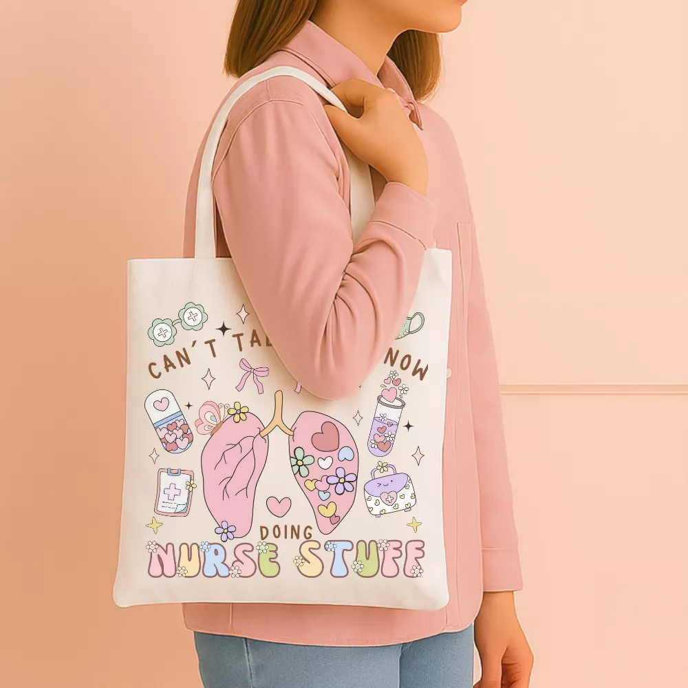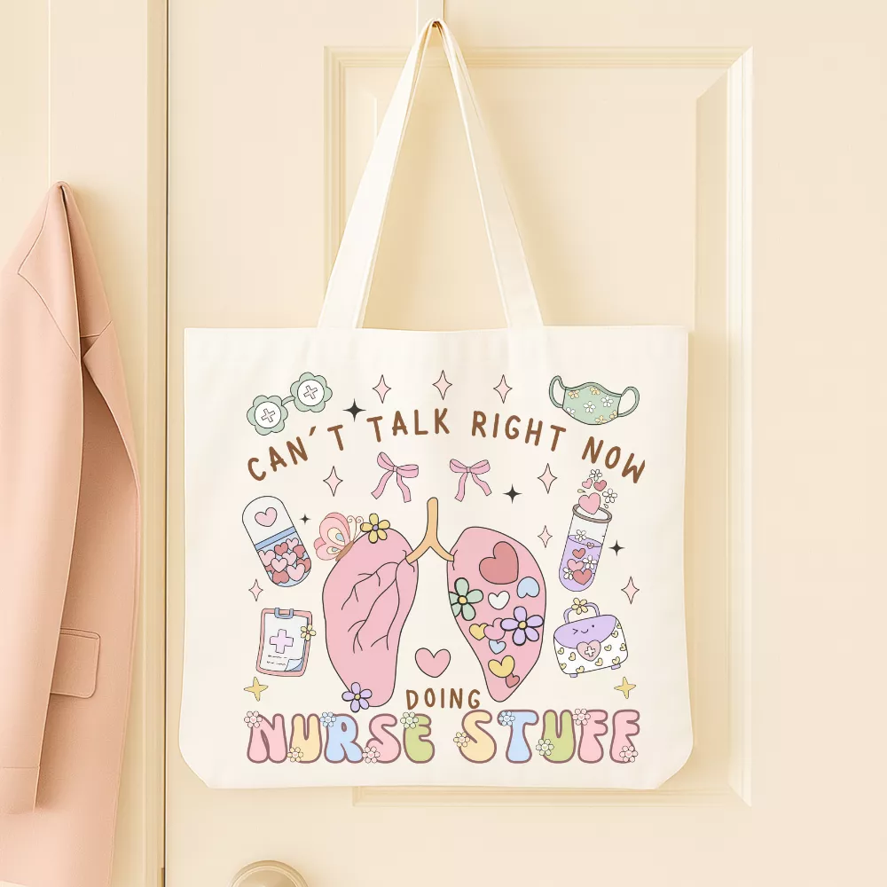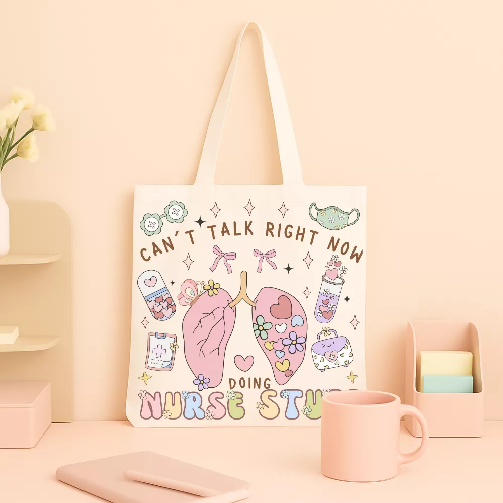 A Healing Nurse Vászontáska vidám, mégis találó grafikájával tökéletesen ragadja meg az ápolói mindennapok pörgős, elhivatott hangulatát. A központi felirat — “Can’t talk right now, doing nurse stuff” — humorosan és őszintén utal arra az életérzésre, amikor minden perc számít, és a hivatás az első. A mintát kedves, pasztell színvilágú ápolói motívumok egészítik ki: tüdőt ábrázoló illusztráció, maszk, gyógyszeres fiola, sebtapasz és szív alakú részletek, amelyek barátságos, szerethető stílusban jelenítik meg az egészségügyi hivatás jelképeit.