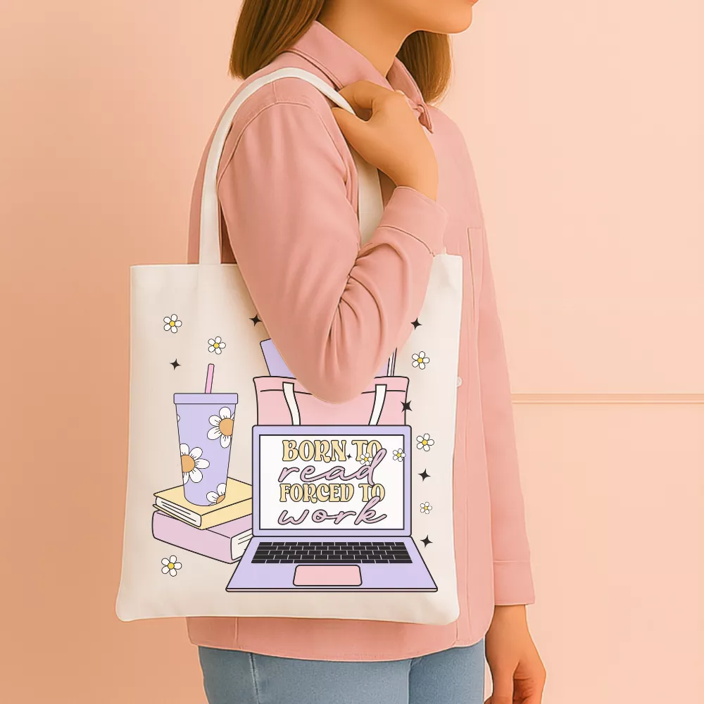 A Library Lights Vászontáska azoknak készült, akik szívük szerint egész nap olvasnának… de a valóság sajnos néha munkára kényszerít. A vidám, pasztellszínű illusztrációk tökéletesen visszaadják ezt a kettősséget: a laptop képernyőjén ott virít a jól ismert, önironikus mondat – „Born to read, forced to work” –, mellette könyvek, táska és egy csinos italos pohár, pont úgy, ahogy egy igazi könyvmoly munkaállomása kinéz.