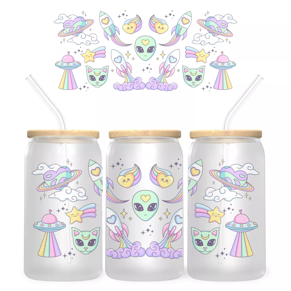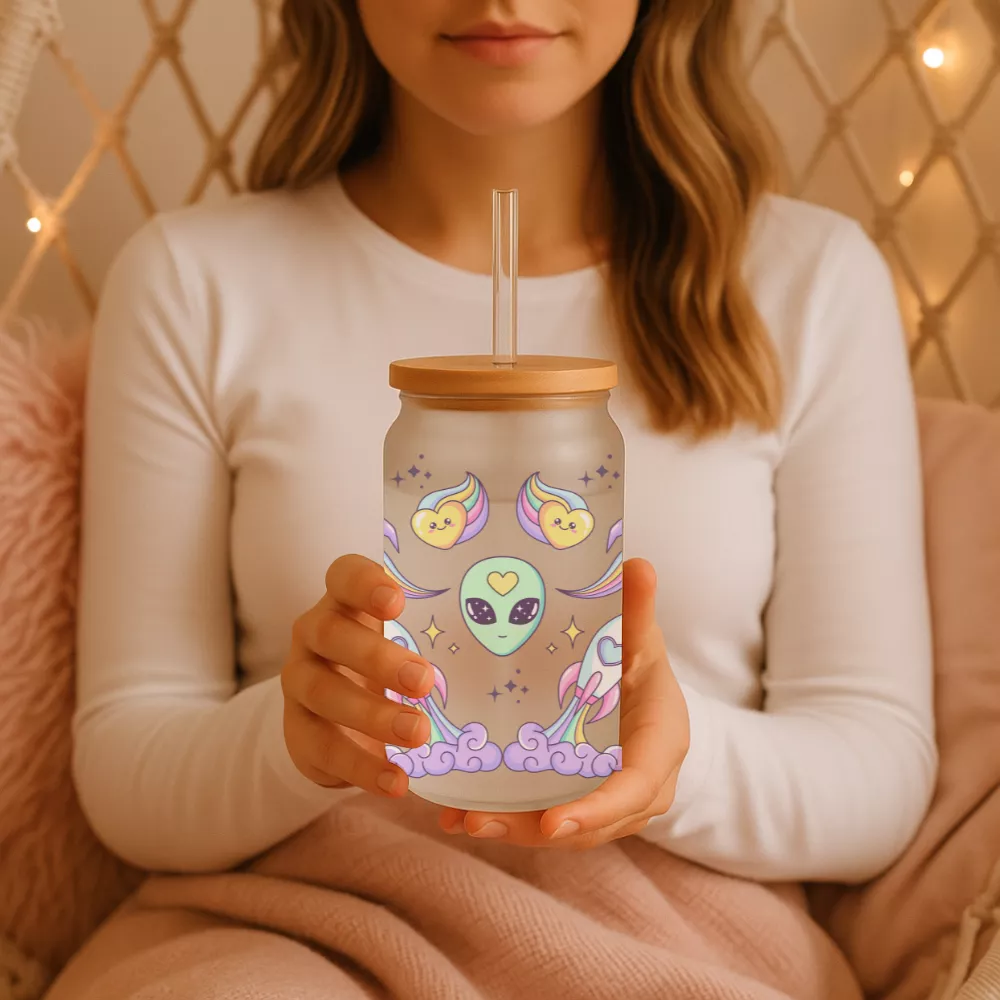 A Love From Space Bambuszfedeles Pohár egy pasztellszínű űrutazás, ahol minden csillag és rakéta a szeretetet sugározza. A középen mosolygó űrlény, szív formájú üstökösök, cuki űrcicák és szivárványos UFO-k egy álomszerű univerzumot alkotnak, amely minden pillanatot különlegessé tesz. A design játékos és romantikus, így tökéletes azoknak, akik hisznek abban, hogy a szeretet tényleg a világűrből jön.