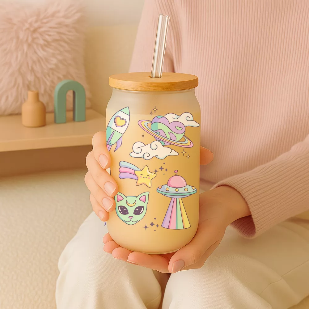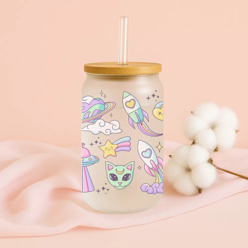 A 473 ml-es Love From Space Bambuszfedeles Pohár prémium minőségű, vastag falú üvegből készül, amely elegáns és tartós egyszerre. A természetes bambuszfedél szorosan zár, így megakadályozza a kiömlést, az üveg szívószál pedig fenntartható, környezetbarát alternatíva a műanyag helyett. A matt üvegfelület kifinomult tapintású, miközben kiemeli a színes, pasztell minták ragyogását.