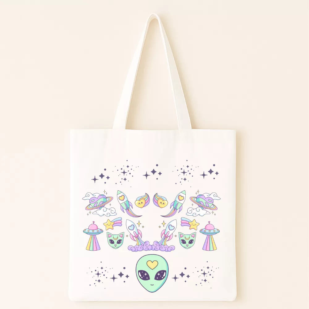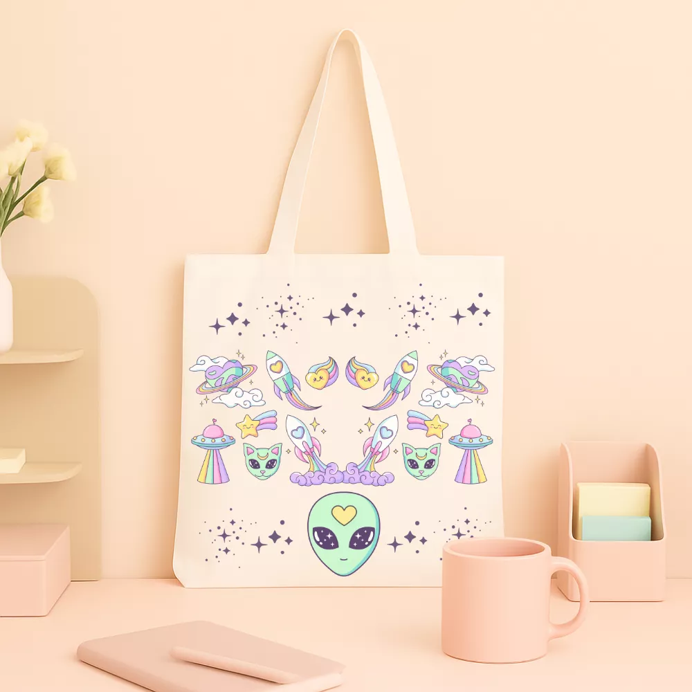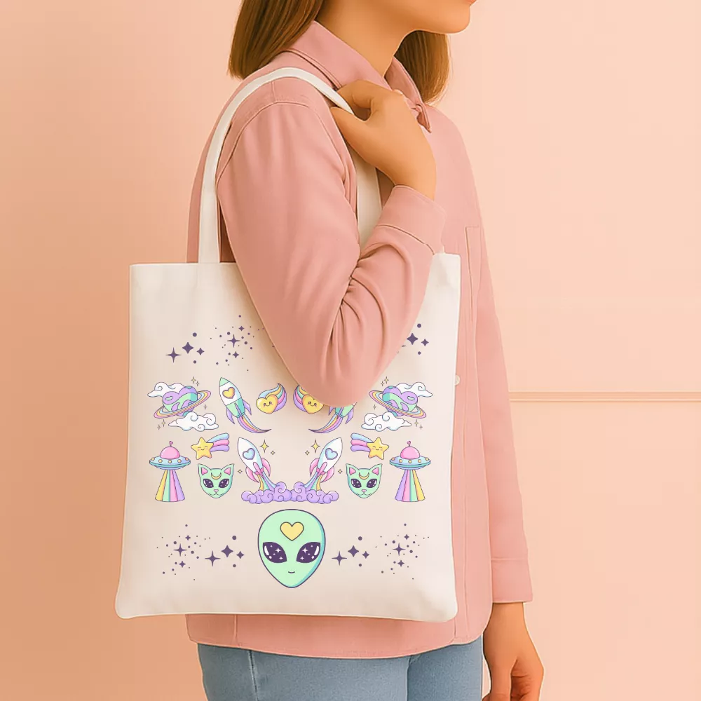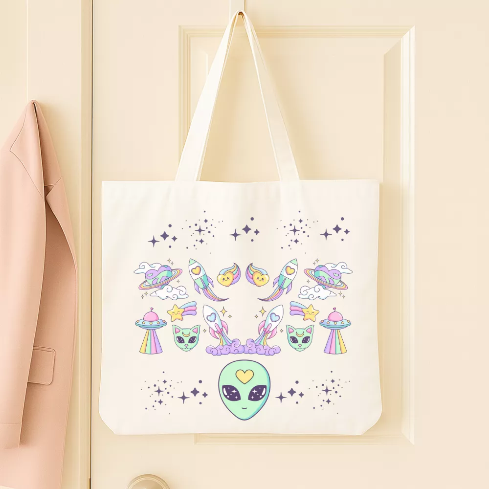 A Love From Space Vászontáska egy pasztellszínű űrutazás hangulatát hozza el a mindennapokba. A középen mosolygó űrlény, a szív alakú üstökösök, a cuki űrcicák és a szivárványos UFO-k együtt egy álomszerű, szeretettel teli univerzumot alkotnak. A dizájn játékos és romantikus – tökéletes azoknak, akik hisznek abban, hogy a szeretet tényleg a csillagok között születik.
