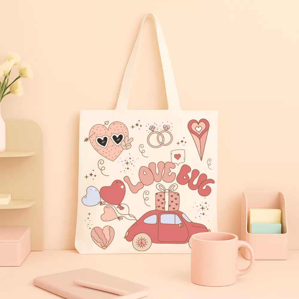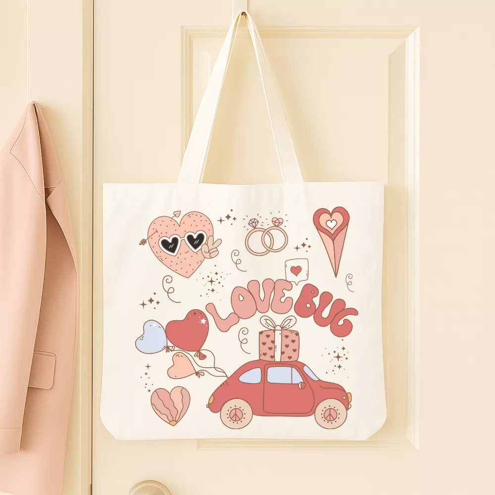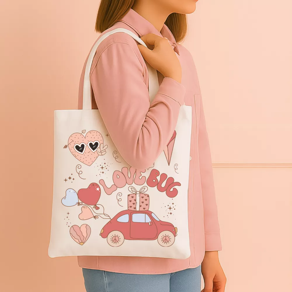 A Magnetic Bond Vászontáska a szeretet mozgásban lévő, vidám és játékos oldalát ragadja meg. A táska központi grafikáján egy bájos, rózsaszín autó gurul végig az úton, a tetején szívecskés ajándékkal, miközben körülötte lebegő szívek, ballonok és romantikus apró motívumok kísérik. A Love Bug felirat könnyed humort és szerethető energiát sugároz, amely egyszerre idézi meg a szerelem izgalmát, a közös utazások örömét és az apró, boldog pillanatokat.