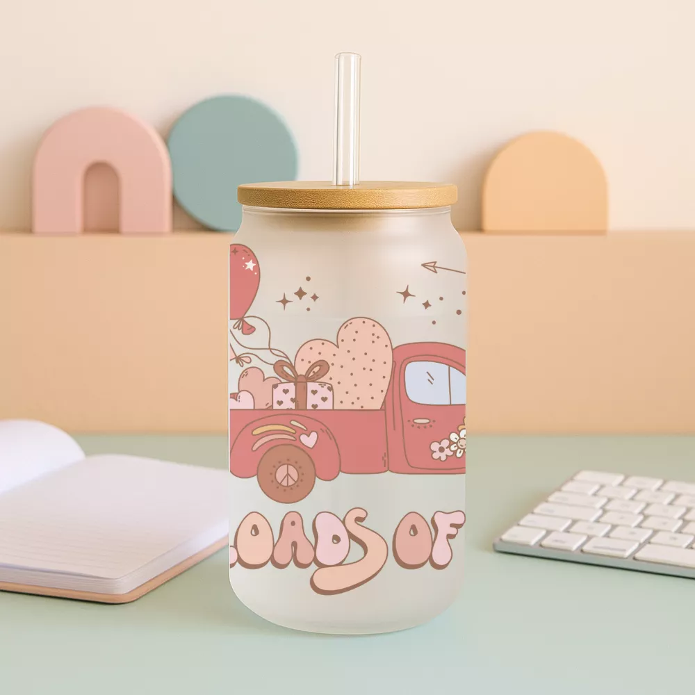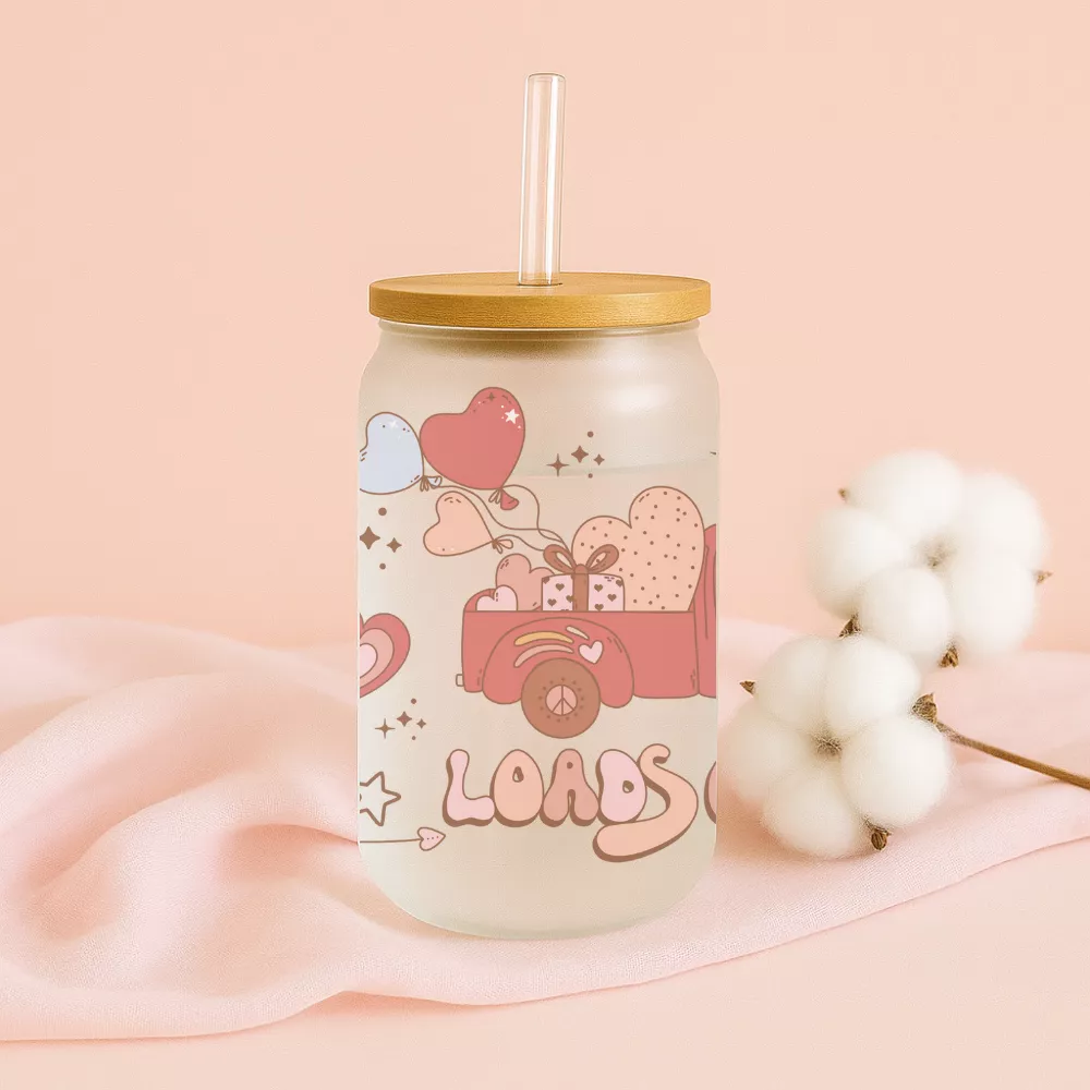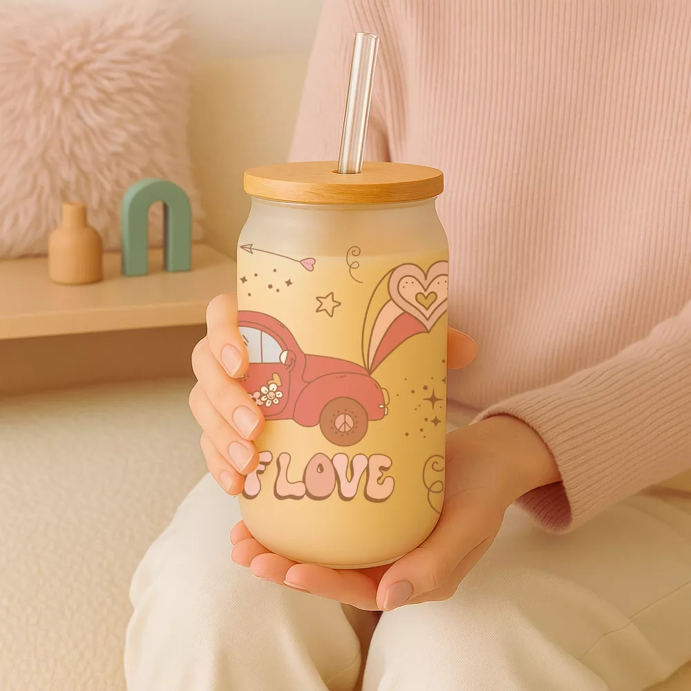 A 473 ml-es, frosted hatású üveg finoman tompítja a színeket, így a rózsaszín, barack és krém árnyalatú grafika különösen harmonikus és megnyugtató összhatást kelt. A természetes bambuszfedél stabilan zár, míg az újrahasználható üveg szívószál praktikus és környezetbarát megoldást kínál a mindennapi használathoz. Ideális jegeskávé, limonádé, tea vagy bármilyen frissítő ital számára, amelyet egy kis romantikus hangulattal szeretnél elfogyasztani.