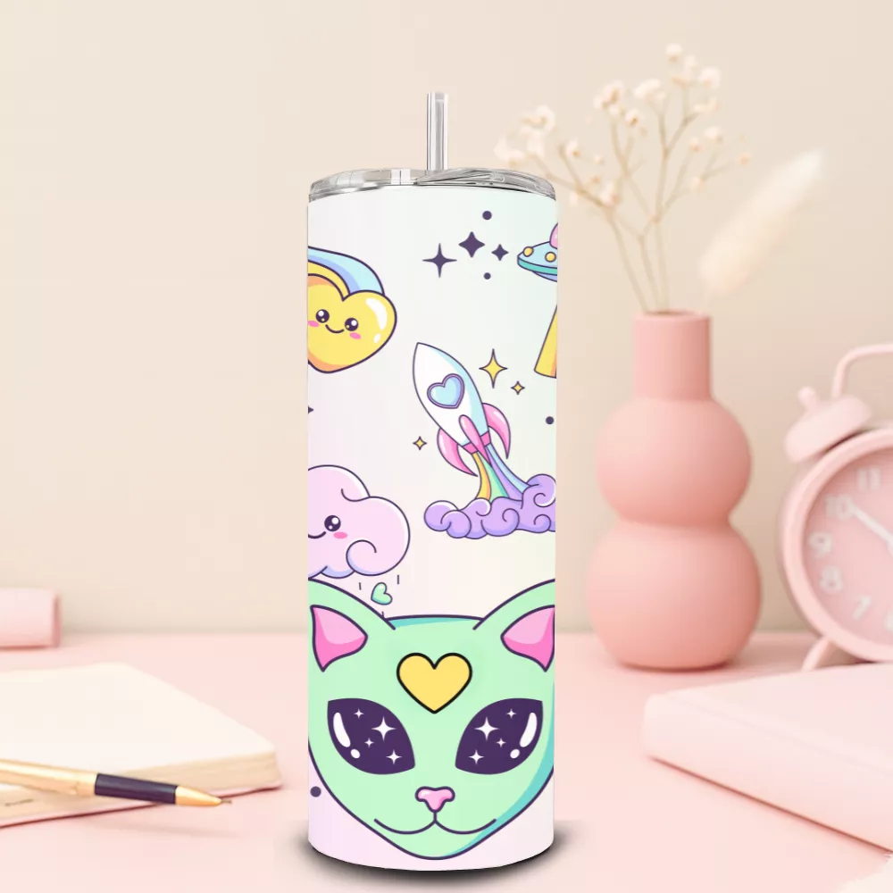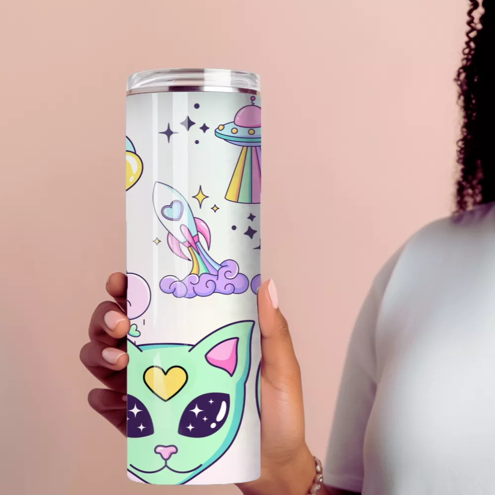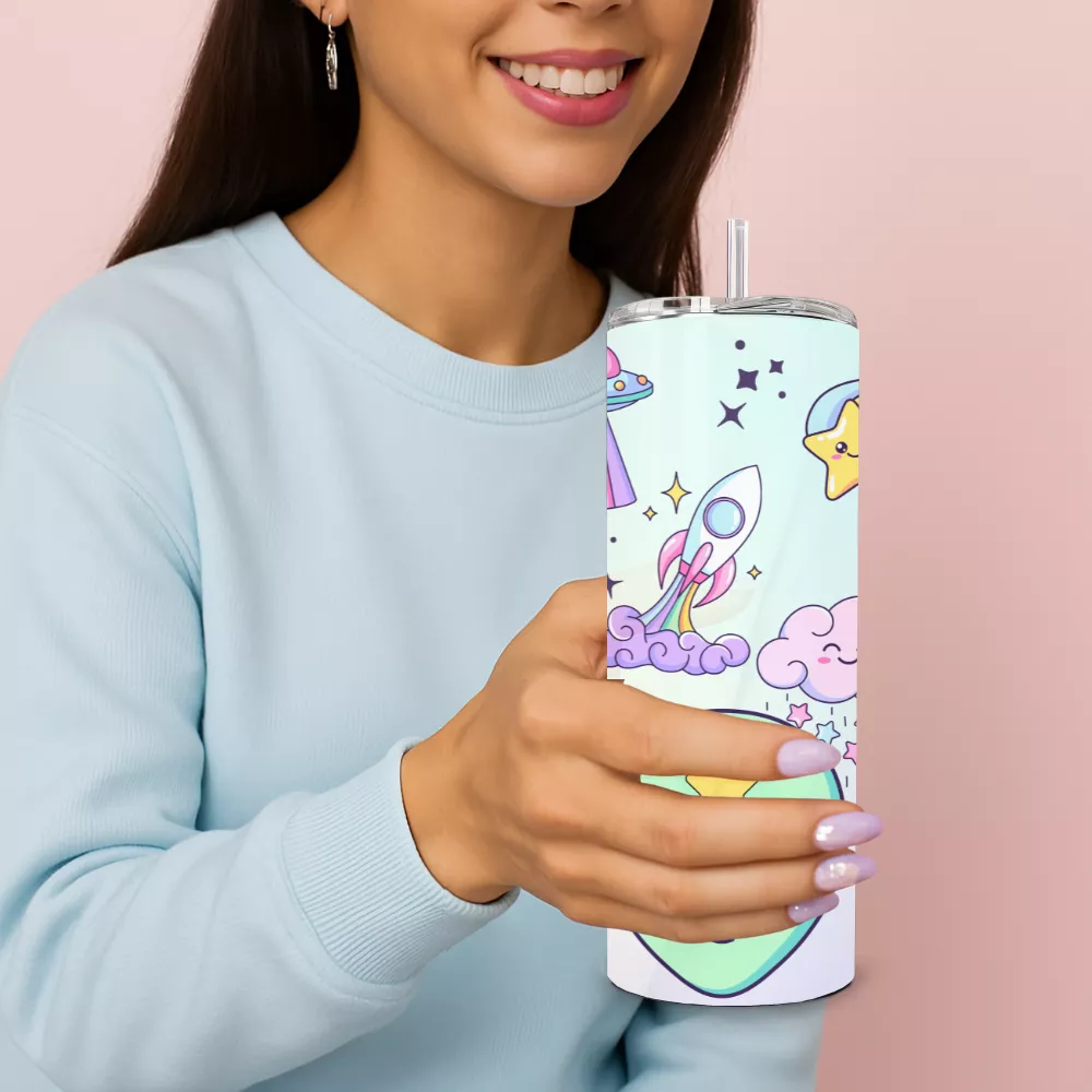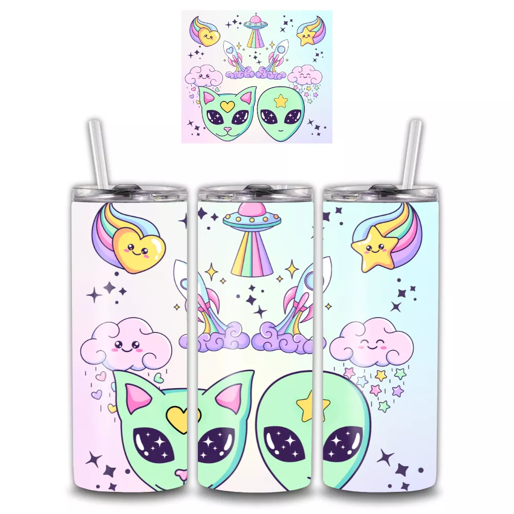 A Milky Way Alumínium Kulacs elrepít egy szivárványos univerzumba, ahol űrlények, cukorfelhők és csillagok táncolnak a tejút fényében. A mintán aranyos zöld űrcica és csillagos fejű kis űrlény néz vissza rád, közöttük pedig vidám UFO-k, rakéták és szivárványokat hullató felhők úsznak. A pasztell színek és a játékos motívumok tökéletes egyensúlyt teremtenek a vidámság és a stílus között.