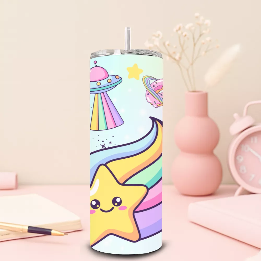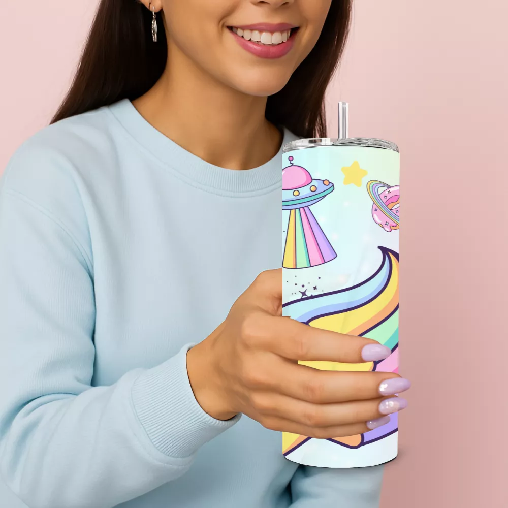 A Pastel Universe Alumínium Kulacs egy igazi szivárványos álomvilágba repít, ahol minden korty egy újabb csillogó kaland. A dizájn középpontjában egy mosolygó hullócsillag áll, amely színes csóvát húz maga után, körülötte pedig UFO-k, rakéták, bolygók és aranyos felhők táncolnak a pasztell égbolton. Ez a kulacs nemcsak a fantáziát, hanem a jókedvet is felébreszti – tökéletes választás, ha egy kis varázslatot vinnél a mindennapokba.