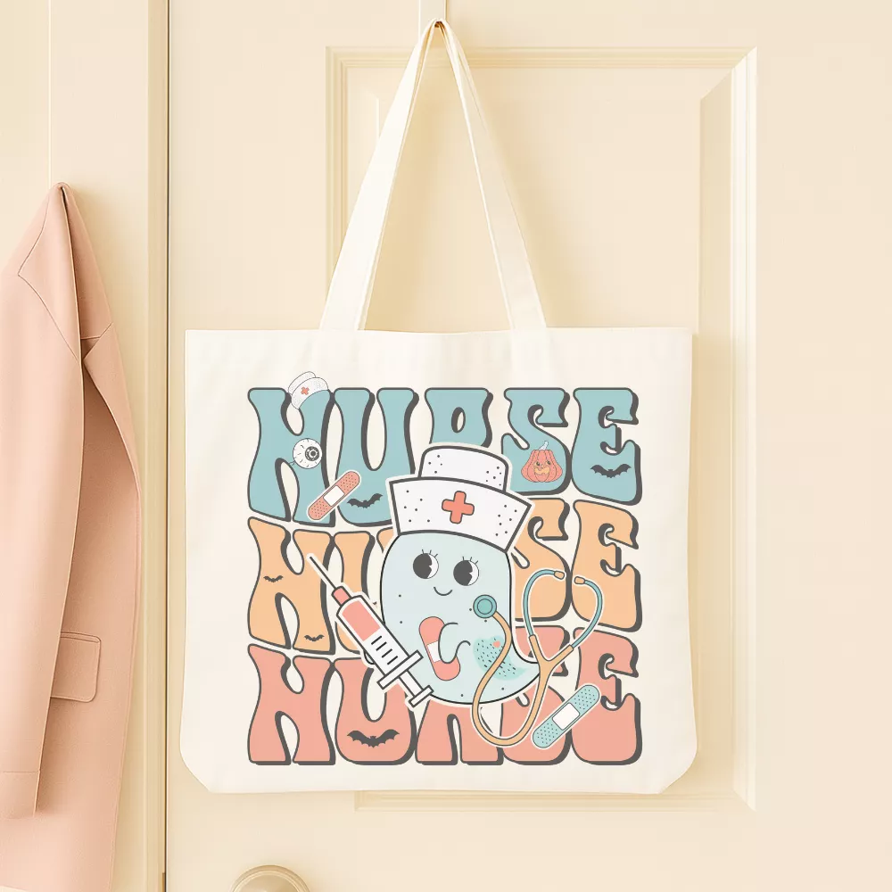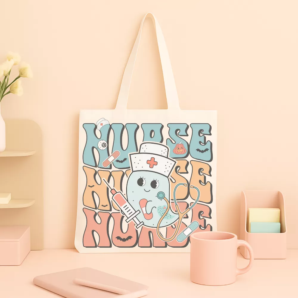 A Phantom Nurse Vászontáska a spooky nurse stílus könnyedebb, játékosabb oldalát mutatja meg — pont azt a humort és önazonos hangulatot, amit az ápolói mindennapok megérdemelnek. A táska központi grafikáján egy mosolygós, rajzolt ápoló karakter jelenik meg ápolói sapkában, sztetoszkóppal, fecskendővel és sebtapasszal, körülötte apró, Halloween-hangulatú részletekkel. A Nurse Life felirat vastag, retró betűtípusa azonnal magára vonja a figyelmet, miközben tökéletes összhangban marad a pasztell, barátságos színvilággal.