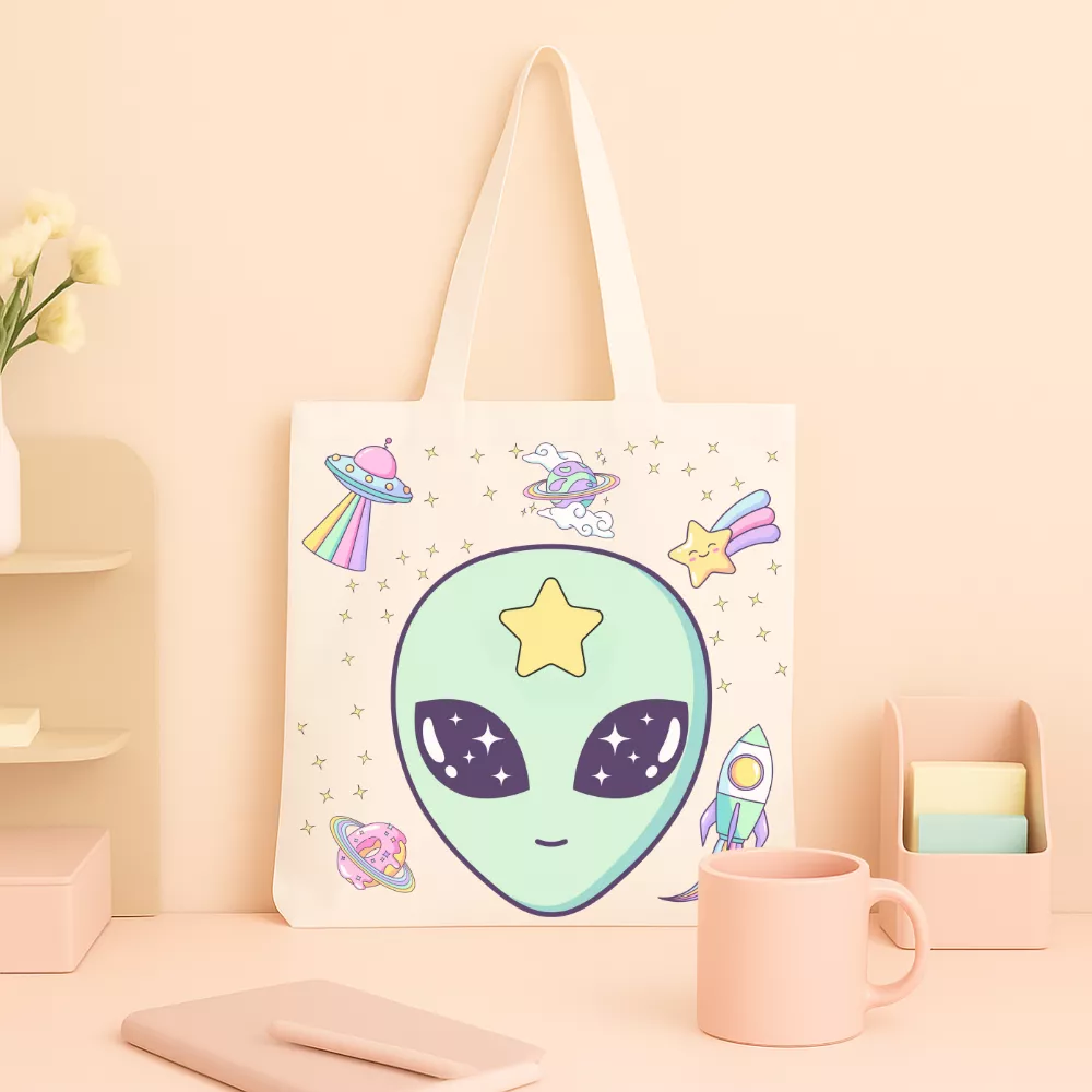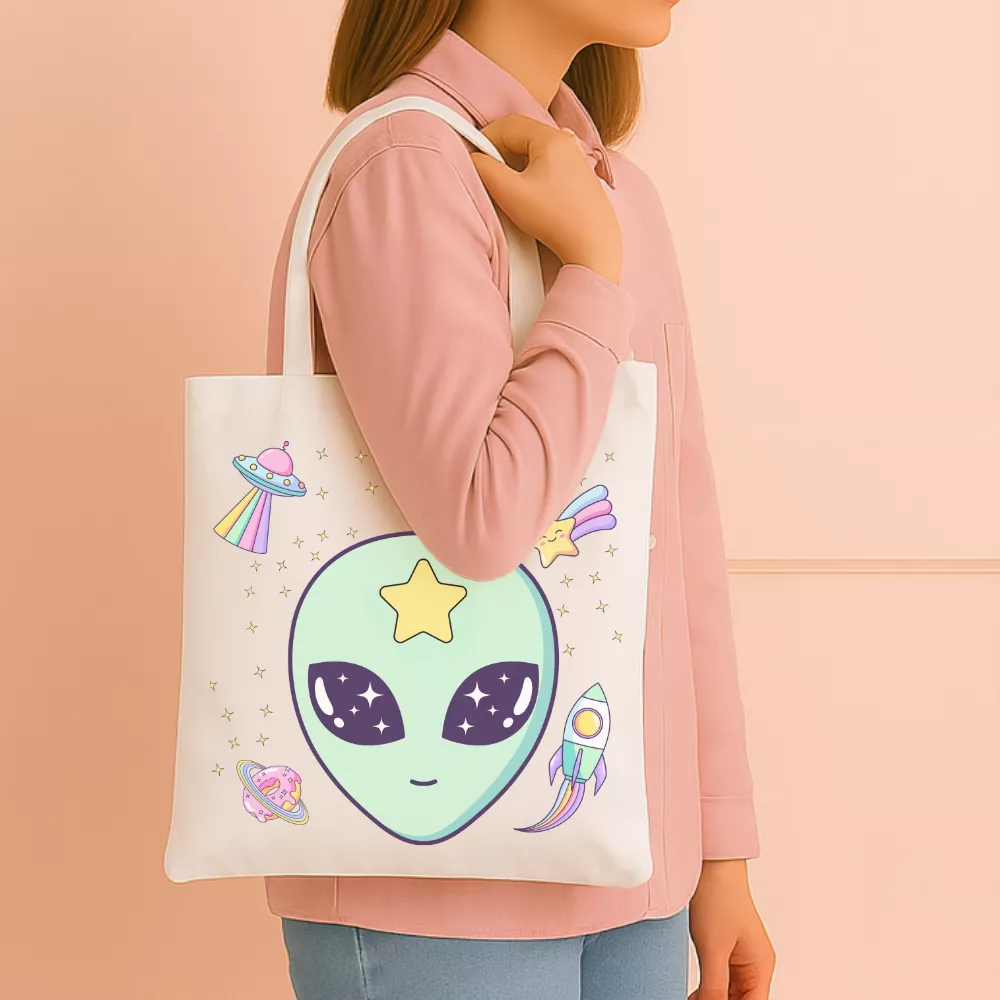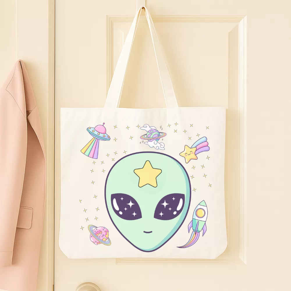 A Rainbow Alien Vászontáska a galaxis legcukibb látogatóit hozza el neked! A középen látható pasztellzöld űrlény aranycsillaggal a homlokán és csillogó szemekkel néz vissza rád, körülötte pedig szivárványos rakéták, mosolygó csillagok és repkedő UFO-k teremtenek könnyed, játékos hangulatot. A vidám, pasztellszínű grafika egyedi stílust ad, amely garantáltan feldobja a mindennapokat.
