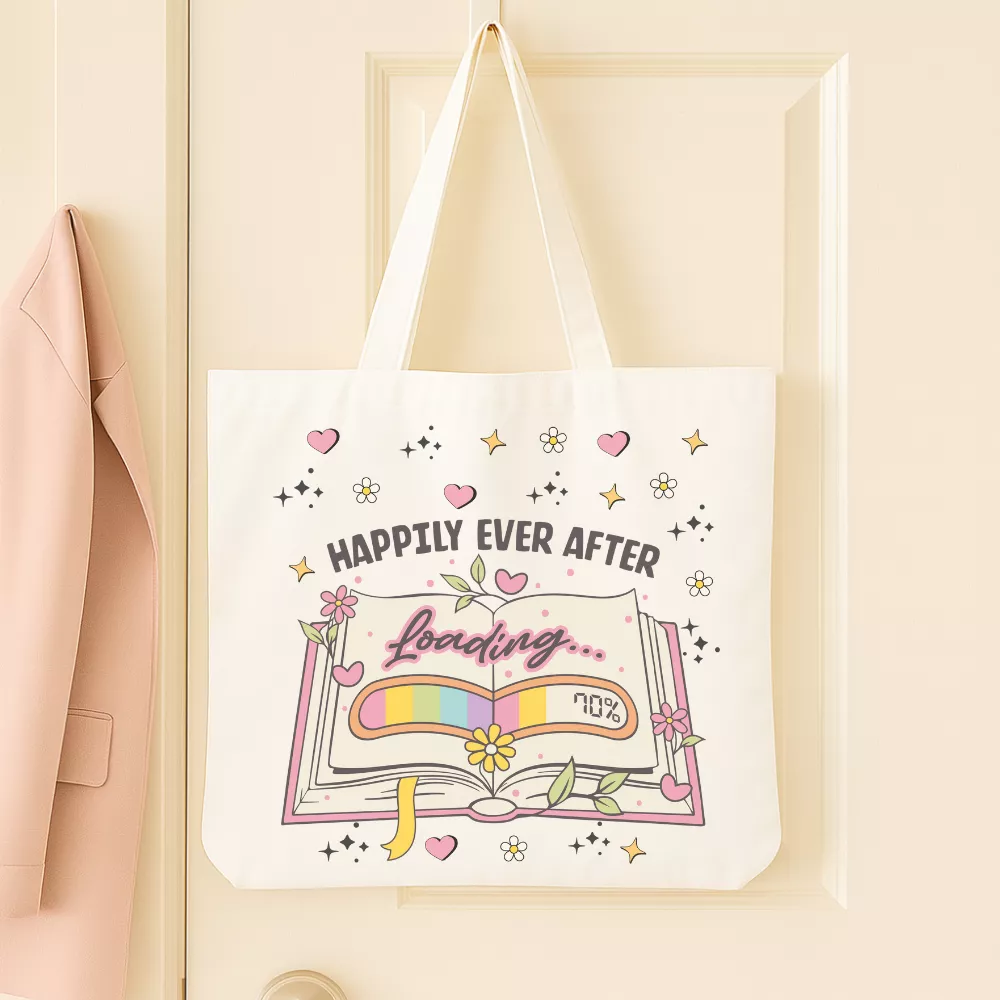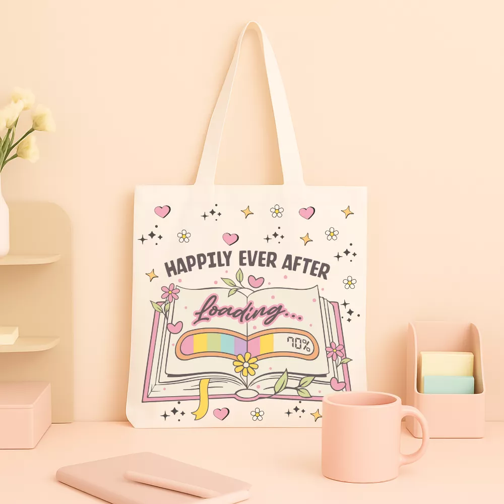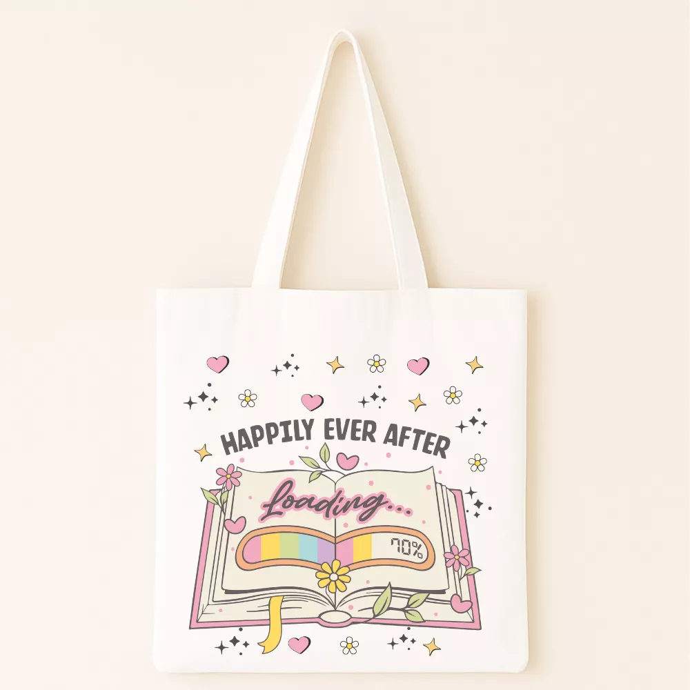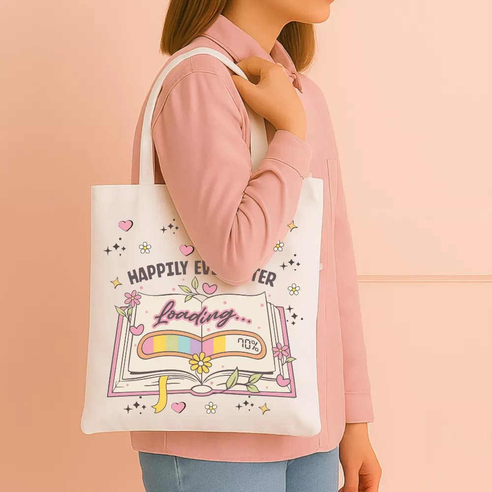 A Reading Realm Vászontáska egy bájos, romantikus hangulatú kiegészítő, amely minden könyvszerető szívét könnyedén meghódítja. A táska központi grafikája egy nyitott, pasztell színekkel illusztrált könyvet ábrázol, amelynek lapjain a „Loading…” felirat és egy százalékjelzés tűnik fel — mintha éppen egy új, saját Happily Ever After történet töltődne be. A könyvet körülölelő virágok, levelek és kis szívecskék finom, álmodozó atmoszférát teremtenek, amely tökéletes dísze a mindennapoknak.
