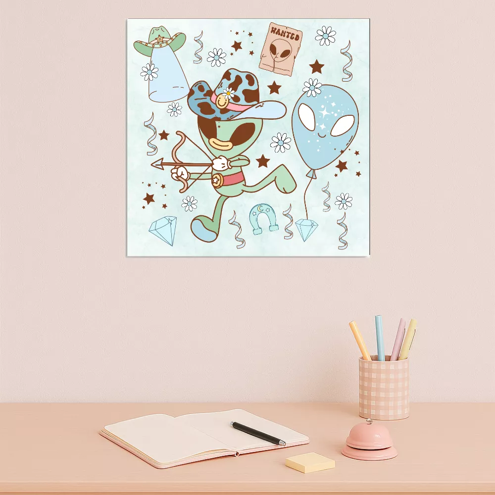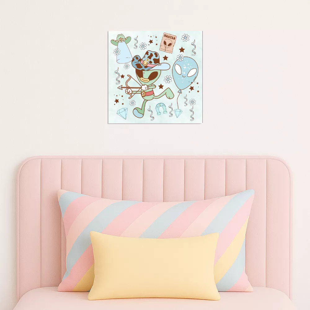 A Retro Rodeo Alumínium Kép a klasszikus western hangulatot és az űrbéli kalandok világát ötvözi egy stílusos, vidám dizájnban. A kékes pasztellszínekben megjelenő cowboy űrlény, a „Wanted” plakát, a patkó, a ballon és a csillagok mind hozzájárulnak a retró életérzéshez. Ez a kép egyszerre vagány és játékos – tökéletes választás mindenkinek, aki szereti a különleges, egyedi mintákat.