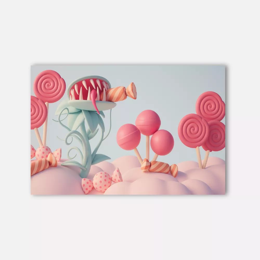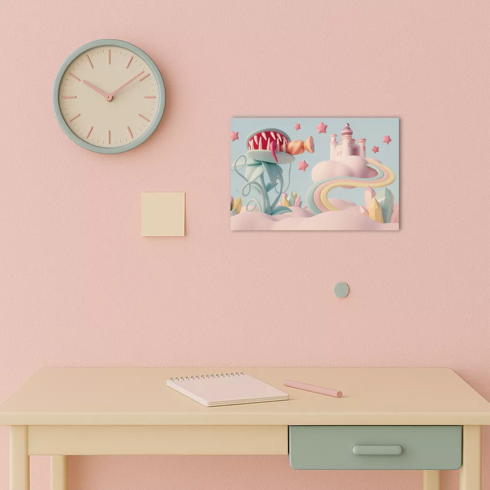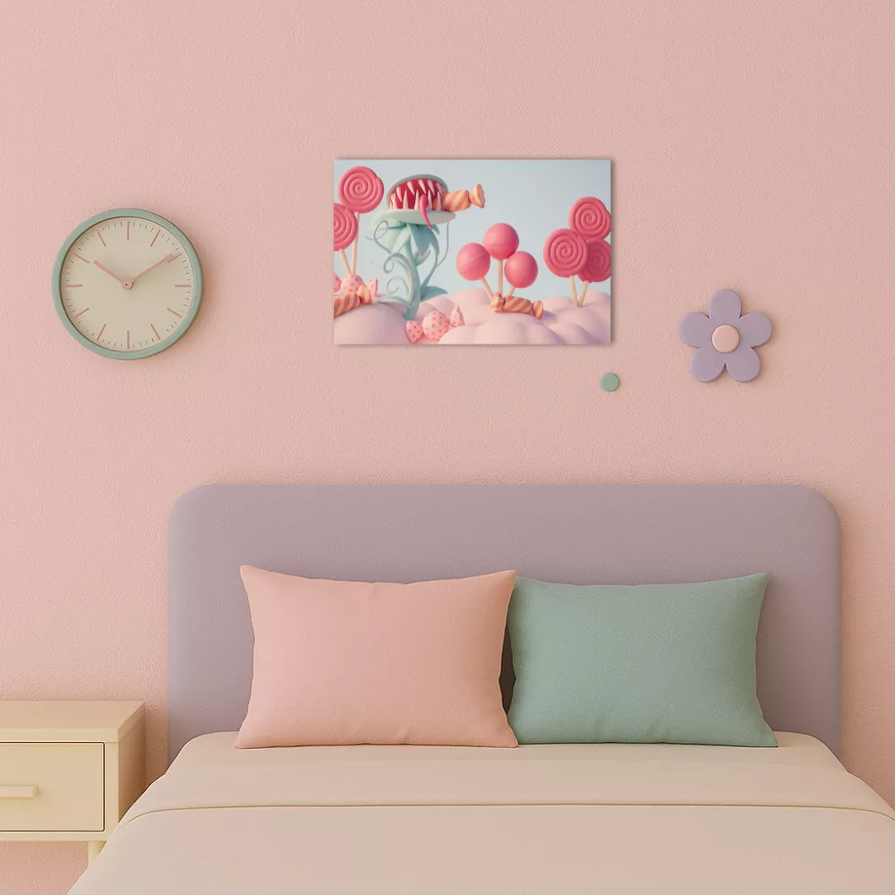 A Snapbloom Dreamer Alumínium Kép egy különleges, cukorkaszínű fantáziavilágba kalauzol, ahol az álom és a valóság határai elmosódnak. A pasztell rózsaszín és kék árnyalatok, a spirál alakú nyalókafák és a játékos növénymotívumok együtt teremtik meg a kép derűs, mégis sejtelmes hangulatát. A 3D hatású grafika életre kelti a jelenetet, így a faldekoráció valódi vizuális élménnyé válik.