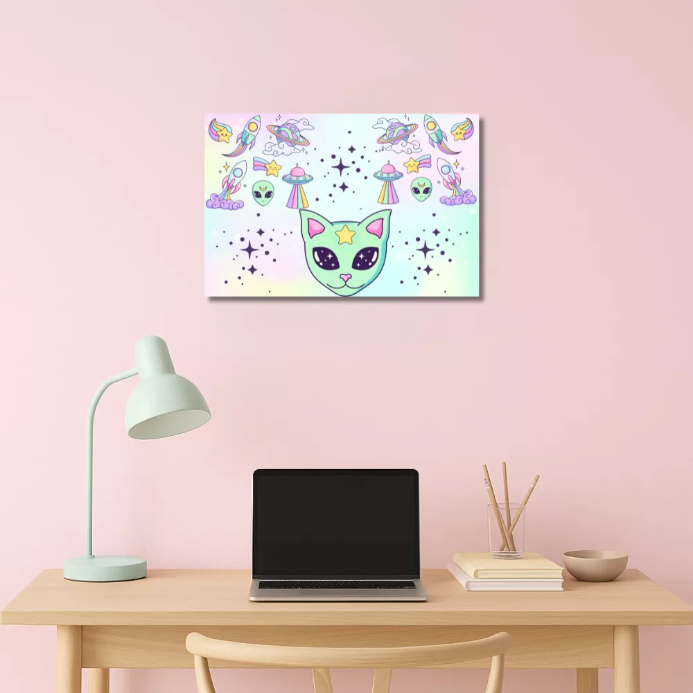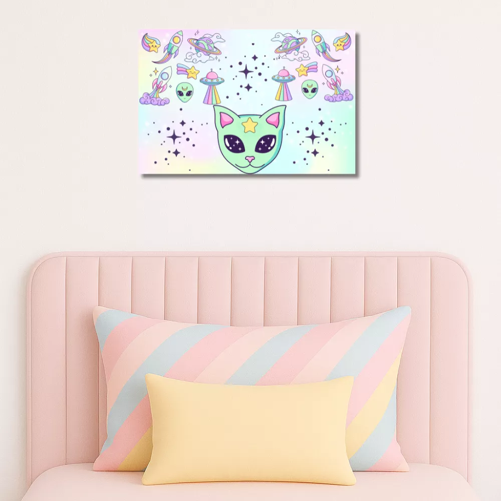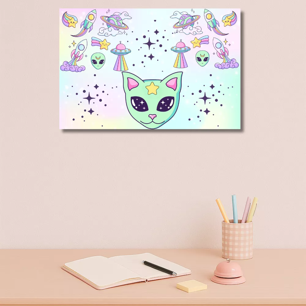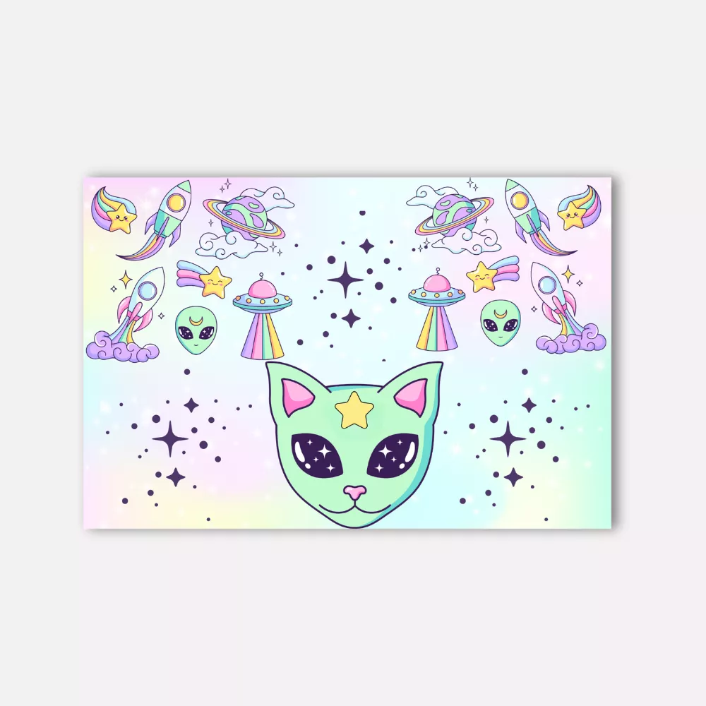 A Space Traveler Alumínium Kép egy pasztellszínű űrutazás, amely minden pillanatban galaktikus hangulatot varázsol az otthonodba. A mintát vidám űrcicák, aranyos űrlények, szivárványos rakéták és csillogó üstökösök díszítik, amelyek egy álomszerű univerzumot keltenek életre. A harmonikus színek és játékos motívumok tökéletesen ötvözik a kawaii és a kozmikus stílust – igazi különlegesség a Lumora kollekcióból.