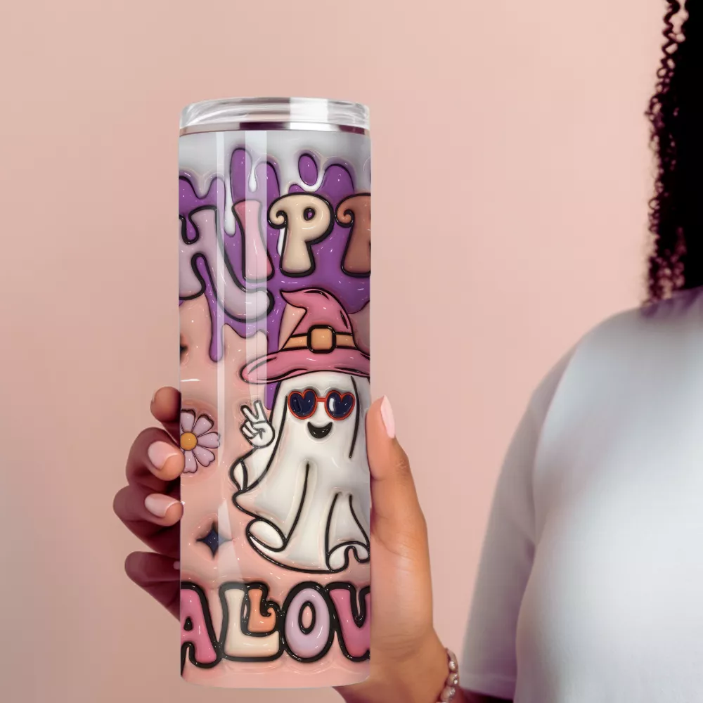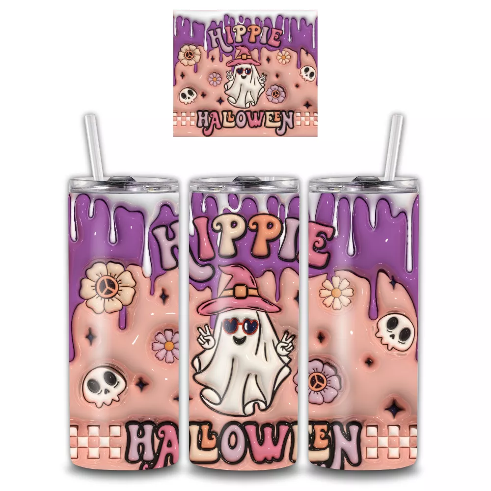 A Spooky Halloween Alumínium Kulacs egyszerre idézi meg a ’70-es évek bohém életérzését és a Halloween játékos, könnyed hangulatát. A lila és barack pasztell háttér 3D hatású mintákkal kel életre: peace-jelekkel díszített virágok, mosolygós kis koponyák, aranyos csillagok és egy napszemüveges, békét mutató kis szellem áll a középpontban. A dizájn tökéletes választás mindenkinek, aki a halloweeni hangulatot inkább cuki, vidám és retró stílusban szereti.