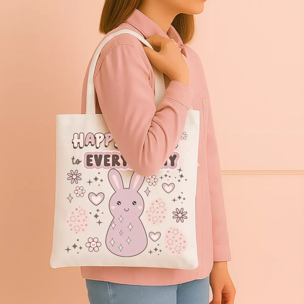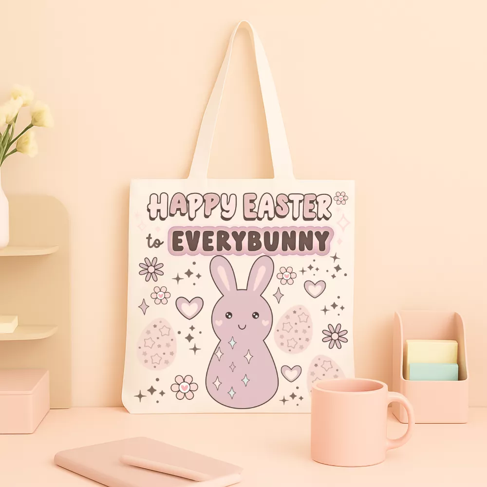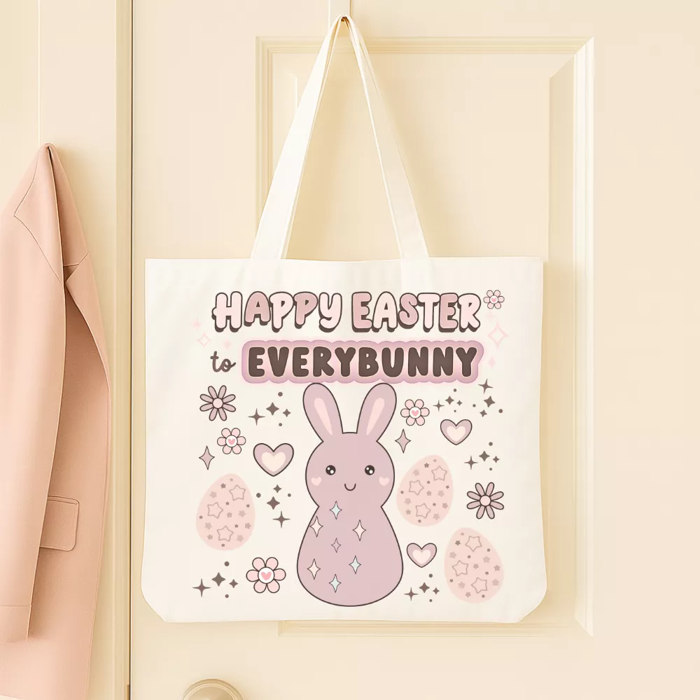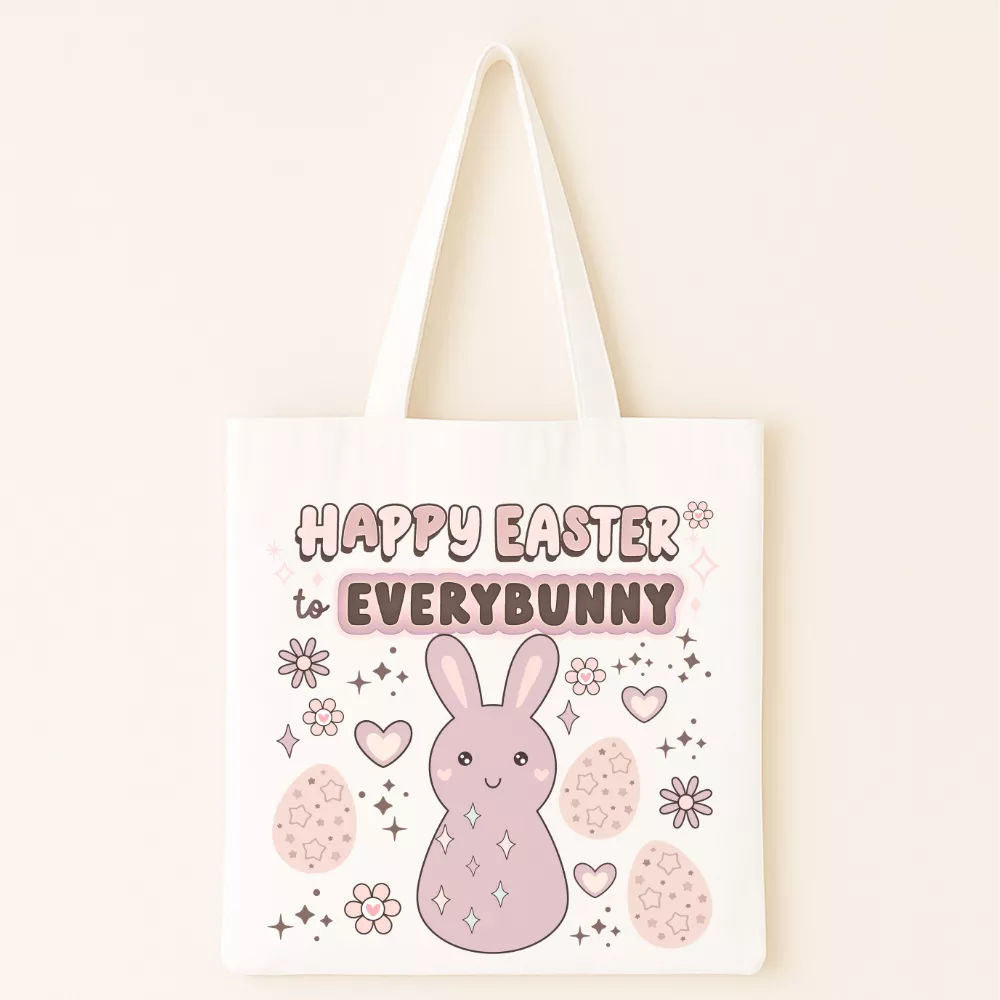A Spring Bunny Vászontáska vidám és kedves húsvéti hangulatot hoz a mindennapokba. A design középpontjában a „Happy Easter to Everybunny” felirat és a bájos rózsaszín nyuszi áll, amelyek együtt játékos, ünnepi atmoszférát teremtenek. A szívecskék, virágok és csillogó részletek még barátságosabbá teszik az összképet, így ez a táska igazi tavaszi kedvenc lehet.