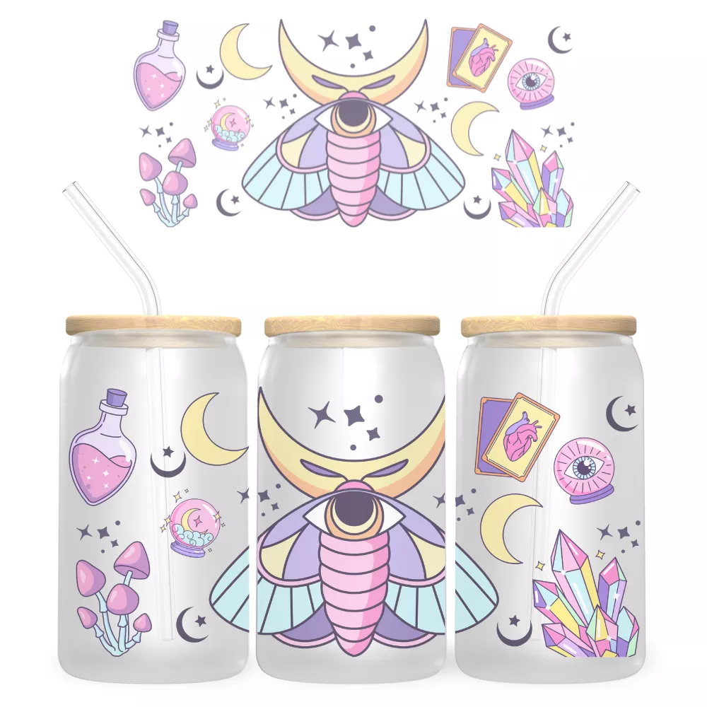 A Stardust Magic Bambuszfedeles Pohár a misztikum, a csillagfény és a pasztell varázslat tökéletes keveréke. A központi grafika egy monumentális, holdszarvakkal díszített misztikus molylepkét ábrázol, amelynek testében egy ősi, mindent látó szem rejtőzik. A körülötte lebegő csillagok, kristályok, tarot-szerű lapok és varázsitalok egy álomszerű, kozmikus hangulatot teremtenek – mintha egy titkos, éjszakai erdő mélyén rejtőző boszorkánylaboratórium elevenedne meg az üvegen.