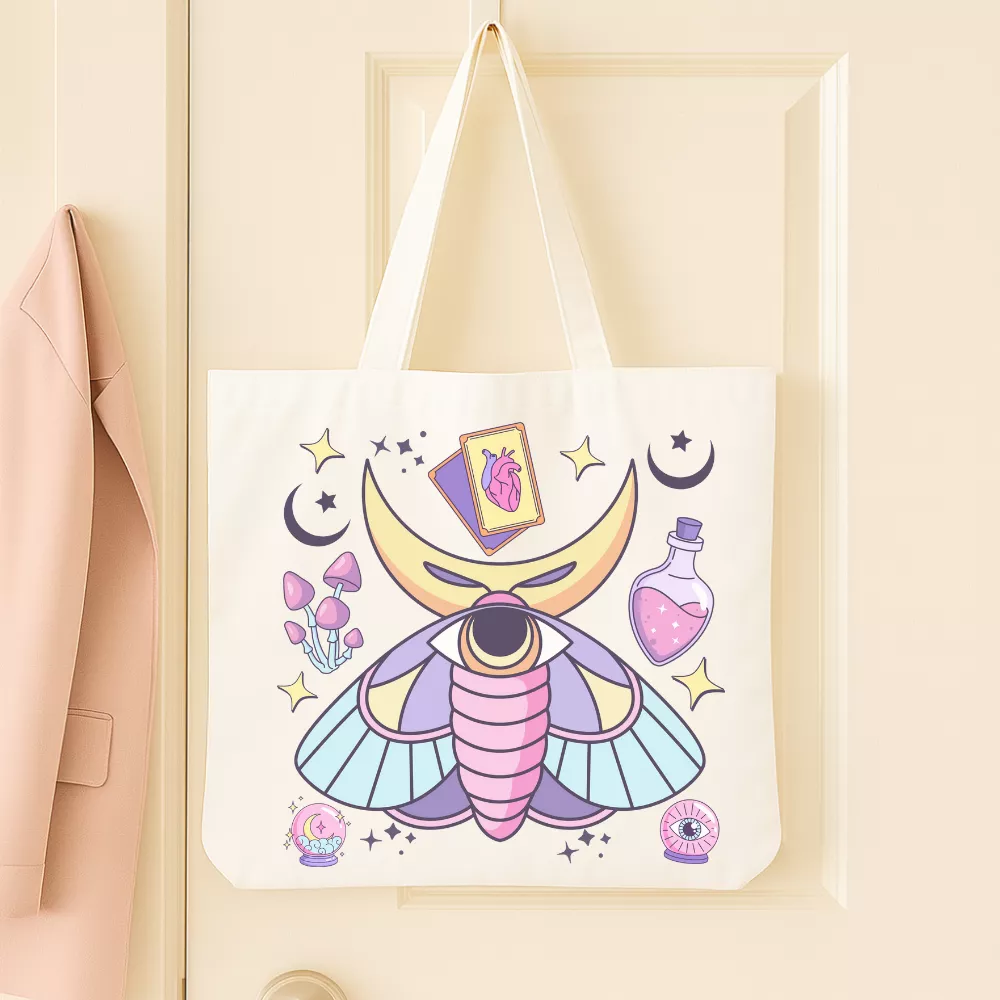 A Stardust Magic vászontáska a misztikum, a csillagfény és a pasztell varázslat tökéletes harmóniáját hozza el a mindennapokba. A táska központi grafikáján egy lenyűgöző, holdszarvakkal díszített misztikus molylepke látható, amelynek testében egy ősi, mindent látó szem rejtőzik. A körülötte lebegő csillagok, kristályok, tarot-lapokra emlékeztető szimbólumok és apró varázsitalok álomszerű, kozmikus atmoszférát teremtenek – mintha egy titkos, éjszakai erdő mélyén működő boszorkánylabor kellékeit hordanád magaddal.