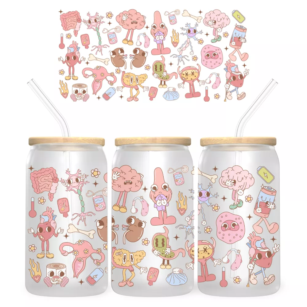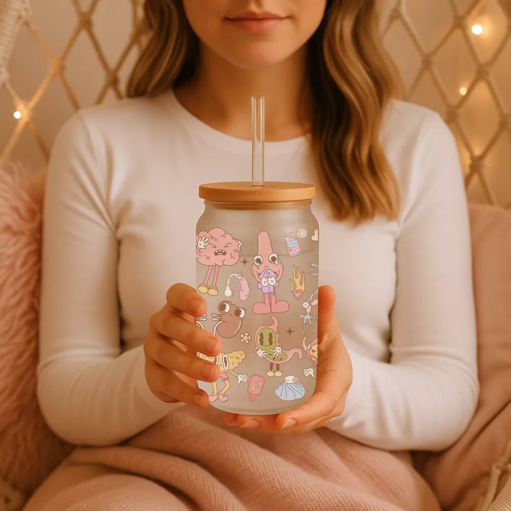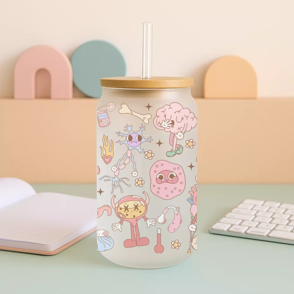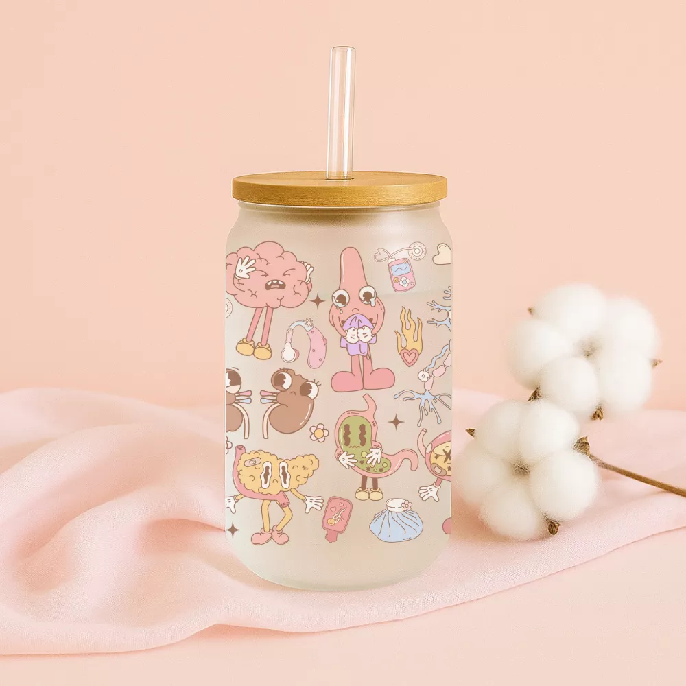 A Strength Care Bambuszfedeles Pohár egy igazán különleges, játékos és egyedi darab, amely humoros stílusban ünnepli az emberi testet, az egészségügyi hivatást és a mindennapi gondoskodást. A poharat borító minták vidám, karakteres anatómiai illusztrációkat ábrázolnak: mosolygó szervek, csontok, szívek, agyak, vesék és egyéb ikonikus elemek kelnek életre pasztell árnyalatokban. A részletek egyszerre szórakoztatóak és figyelemfelkeltők, miközben szerethető, könnyed hangulatot teremtenek.