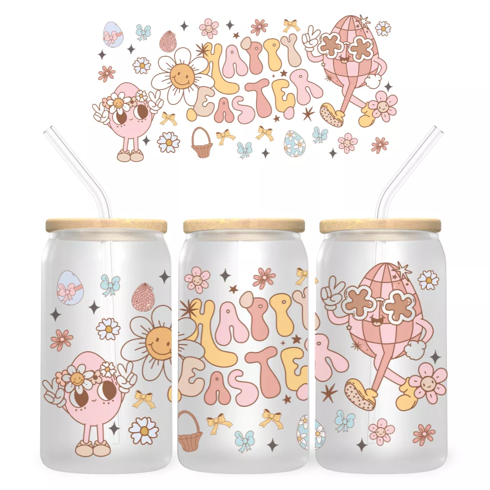 A Sweet Easter Bambuszfedeles Pohár vidám és játékos húsvéti hangulatot varázsol a mindennapokba. A poharat aranyos húsvéti figurák, mosolygó virágok, díszített tojások és a „Happy Easter” felirat díszíti, amelyek együtt egy igazán színes és ünnepi design-t alkotnak. A karakteres, napszemüveges tojás és a virágkoszorús kis figura különösen kedves és egyedi megjelenést ad a mintának.
