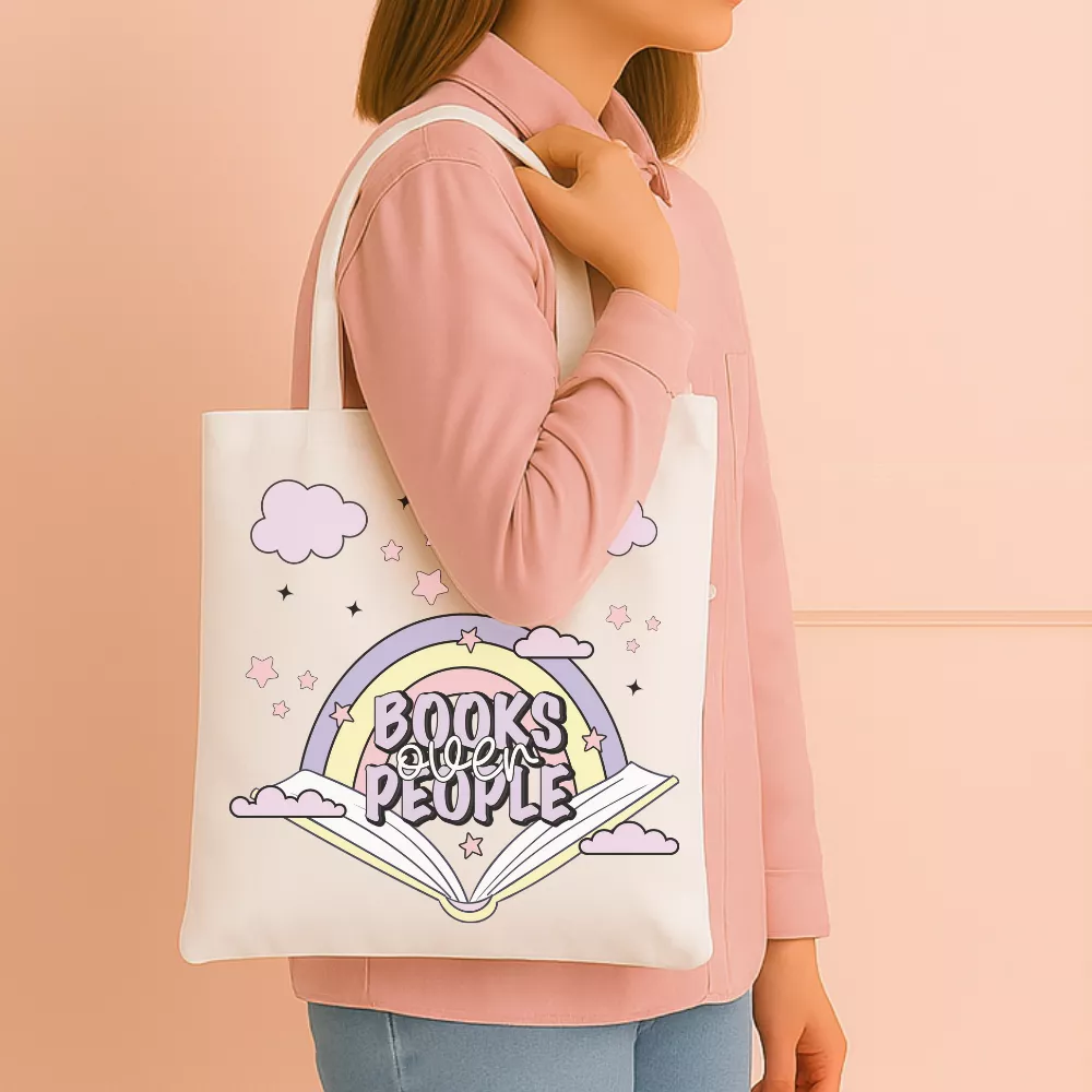 A Tale Haven Vászontáska tökéletes választás mindenkinek, aki már rég eldöntötte: a könyvek néha tényleg jobb társaságot jelentenek. A táska fő grafikáján egy nyitott könyvből kibomló pasztellszínű szivárvány látható, amelyet puha rózsaszín felhők, apró csillagok és kedves díszítőelemek vesznek körül. A játékos, mégis egyértelmű üzenet — Books Over People — mosolyt csal minden könyvszerető arcára.