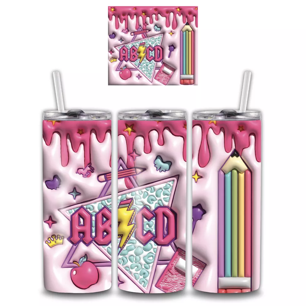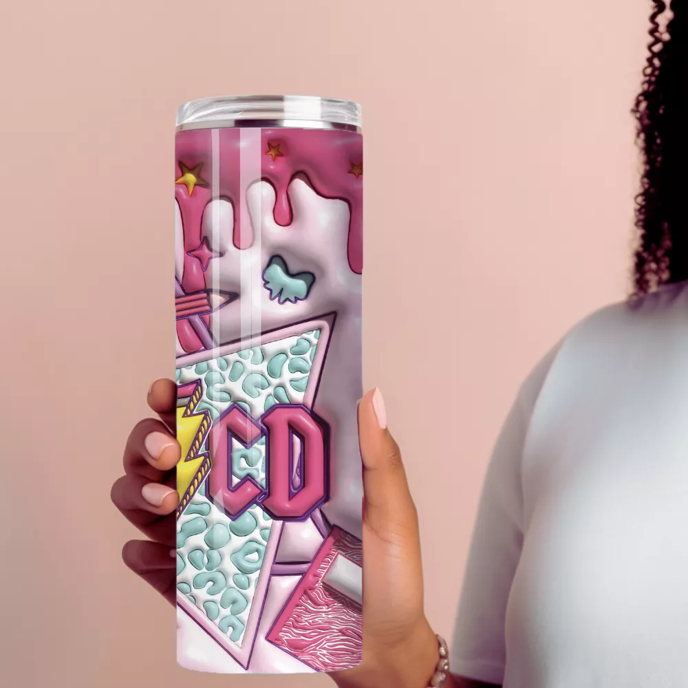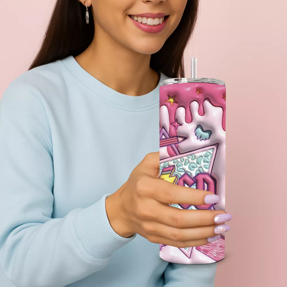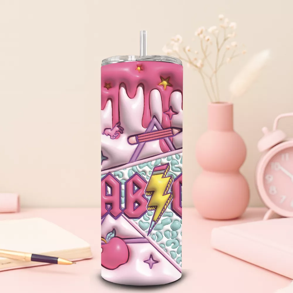 A Teacher Magic Alumínium Kulacs a tanári kreativitás, energiabomba-hangulat és játékos szimbolika látványos találkozása. A pink–pasztell színvilág, a 3D hatású betűk, a villámos „ABCD” felirat és a cuki taneszközök – ceruzák, könyvek, alma, formák – mind azt üzenik: a tanítás varázslat. A hullámzó háttér és az ikonikus csöpögő dizájn még különlegesebbé teszik, így ez a kulacs garantáltan kitűnik a tanáriban vagy az iskolai folyosón.